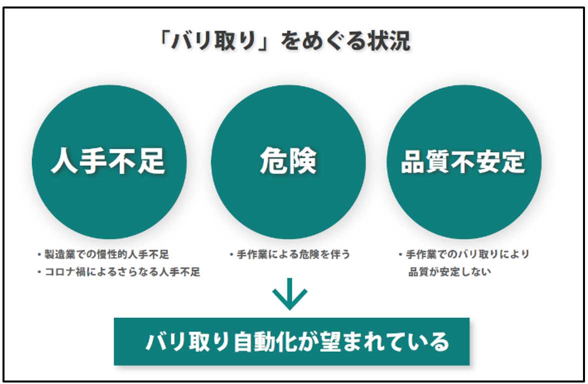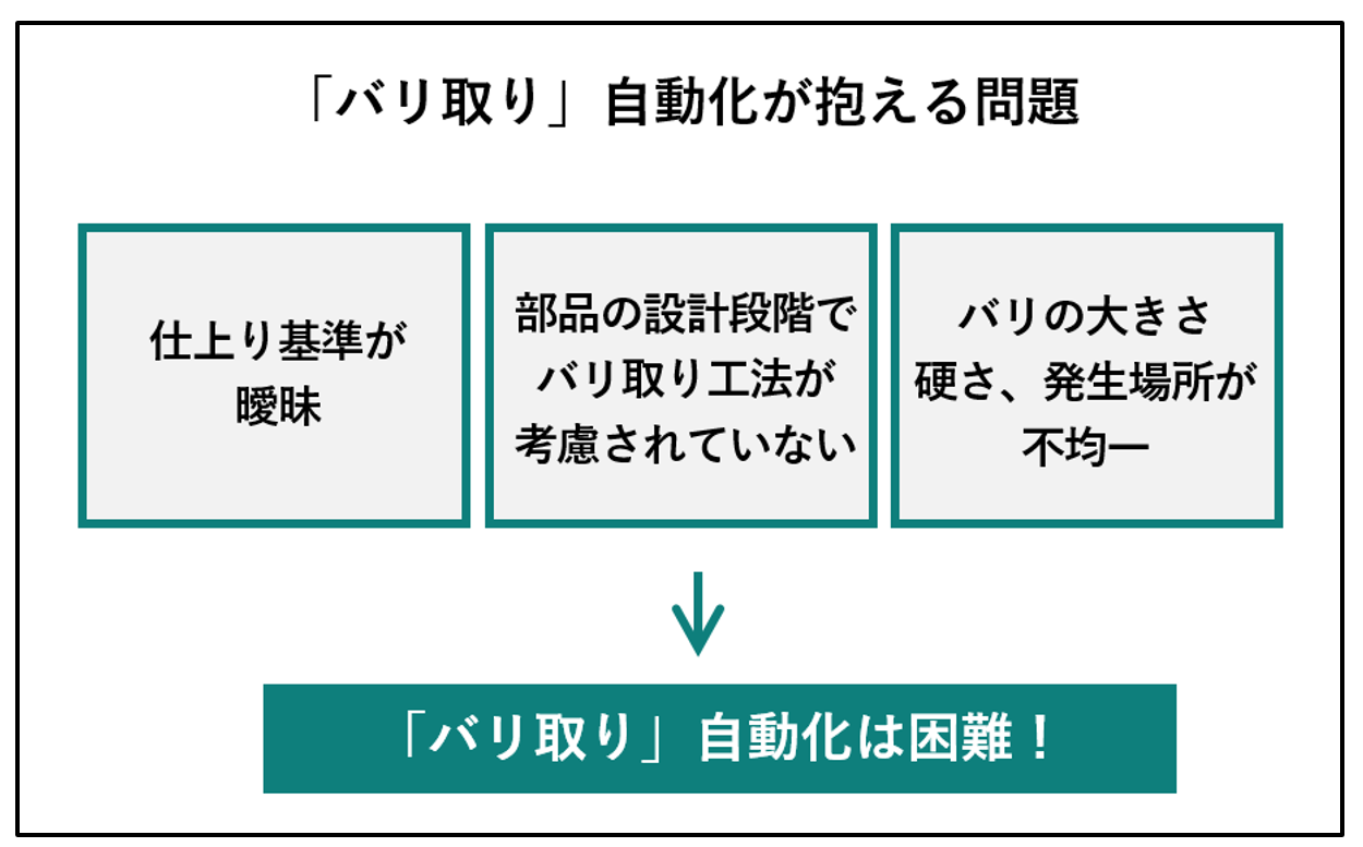 ものづくりの現場において、手作業が主流のバリ取りは、人手不足や危険作業、品質の不安定さといった問題から自動化が望まれている工程です。