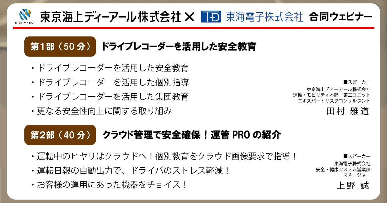 飲酒運転防止のためのアルコール検知器及びIT点呼システムを開発・販売する東海電子株式会社(本社:静岡県富士市 代表取締役:杉本 哲也)は、 この度、デジタル技術を駆使してリスクを的確に解決するエキスパート集団、東京海上ディーアール株式会社(本社:東京都千代田 代表取締役社長:嶋倉 泰造)とコラボウェブセミナー「ドライブレコーダーの動画 あなたなら、どうする?」を2月2日(水)に無料開催いたします。