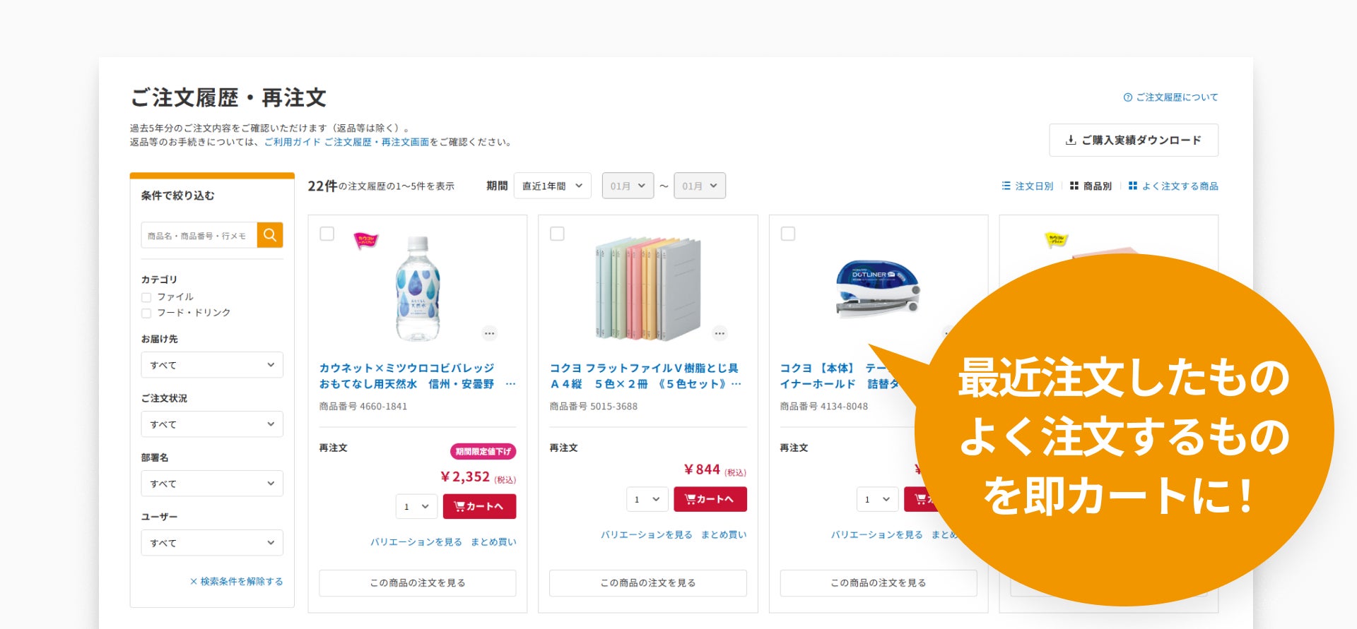 過去に注文した商品をお得なタイミングで再注文可能