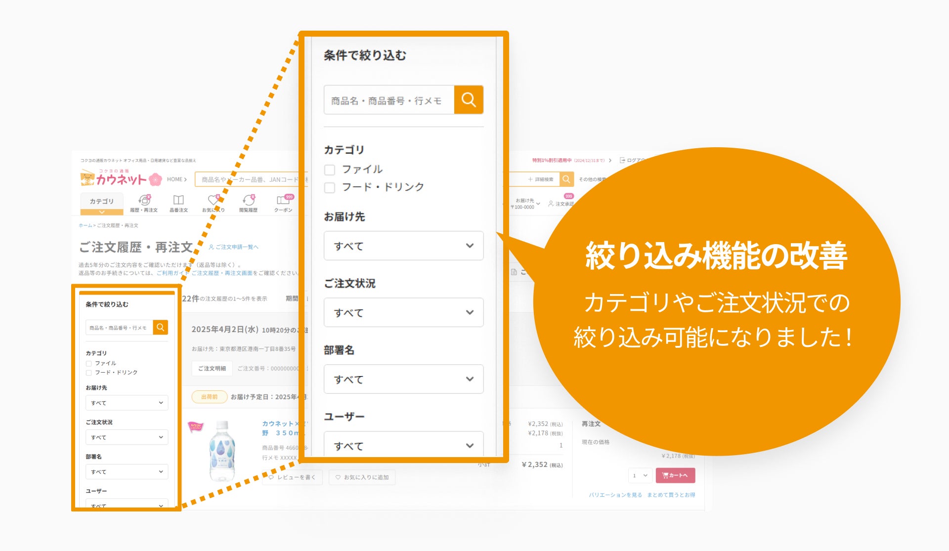 カウネット、注文履歴ページの検索性と利便性を強化