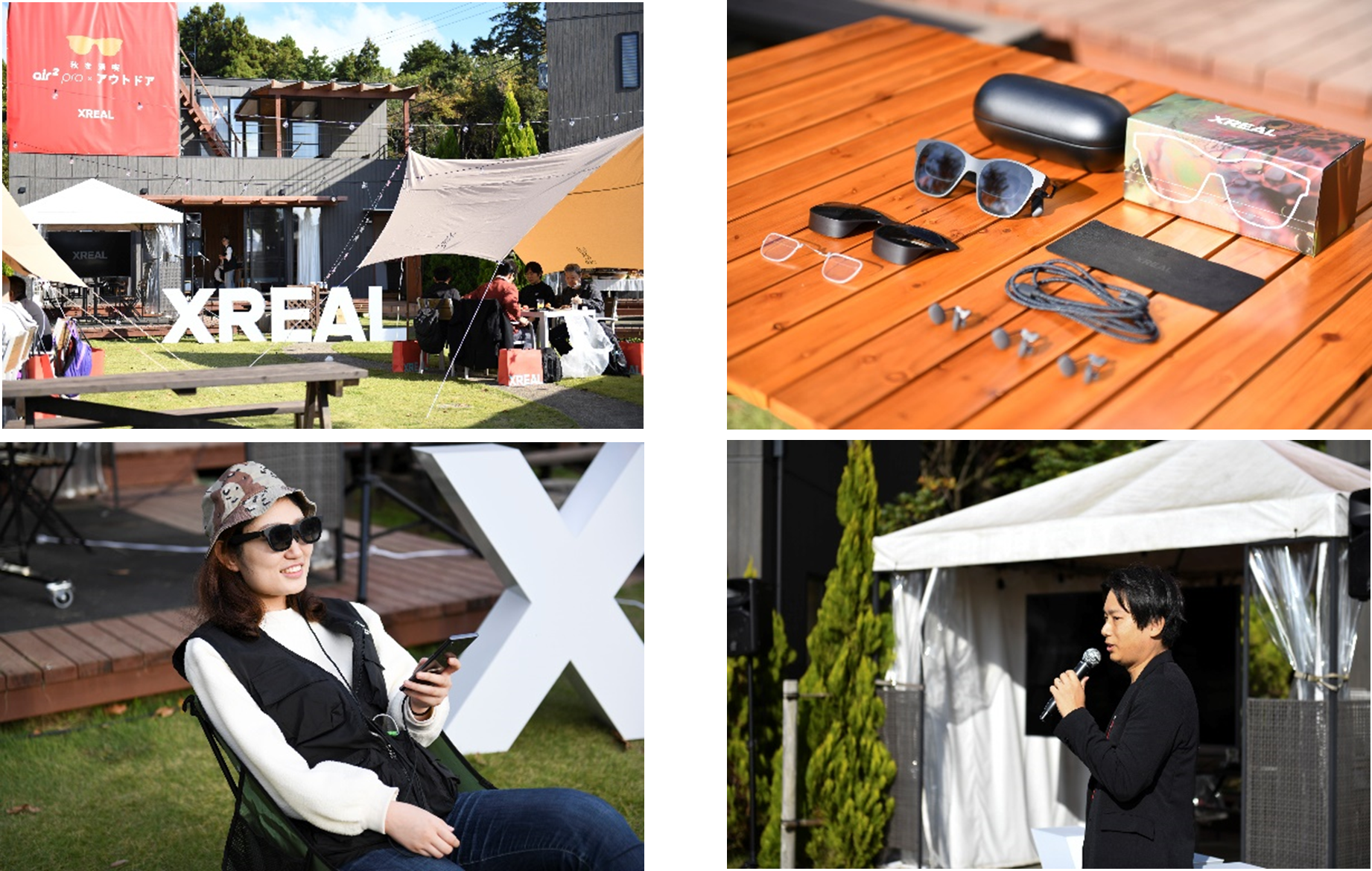 本イベントでは、レンズの暗さ(エレクトロクロミック調光のレベル)を調整できるサングラス型ARグラス「XREAL Air 2 Pro」をキャンプ場でお試しいただきました。イベントでは屋外テントやコテージの中など様々な明るさの中で「XREAL Air 2 Pro」を使用していただき、ARグラスの新しい楽しみ方を体験していただきました。また当日は、日本Xrealの中澤 真人(Communication manager・広報課長)より「XREAL Beam」のアップデート、ヨーロッパ上陸や中国でのマーケティング施策などのグローバル戦略、11月17日からスタートするブラックフライデーのキャンペーンなどに関してプレゼンテーションいたしました。