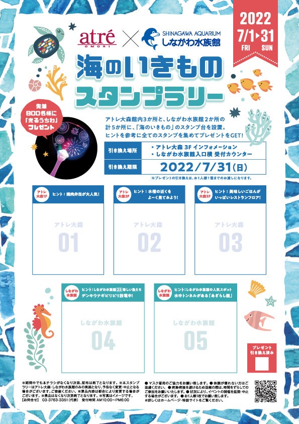 アトレ大森3ヶ所、しながわ水族館2ヶ所に「海のいきもの」のスタンプ台を設置!ヒントを参考に5ヶ所全てのスタンプを集めると、先着800名様に夏の夜にピッタリな「光るうちわ」をプレゼント♪