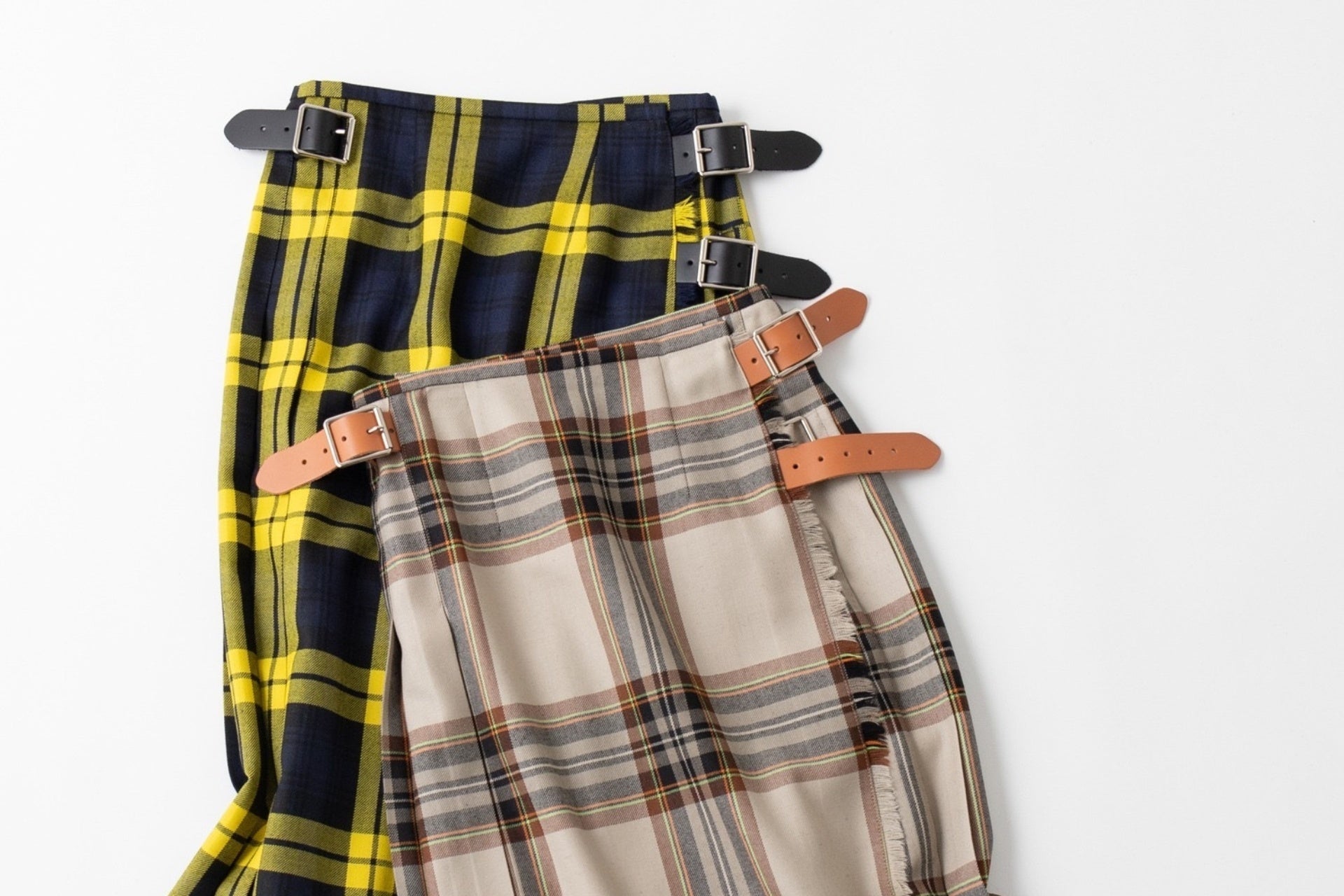 バリエーション豊かなタータンチェックのキルトスカートを展開します。