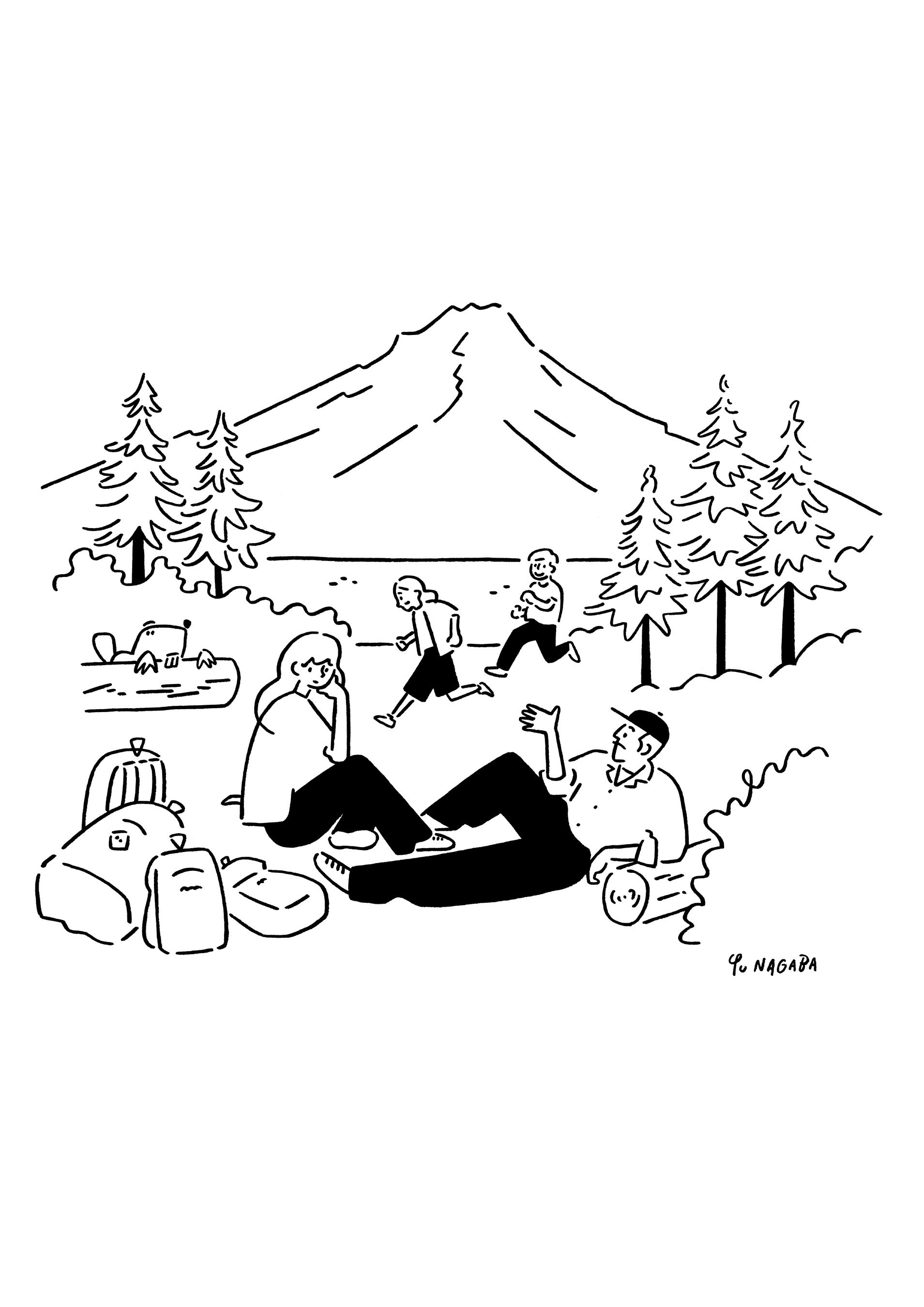 本コレクションはブランド生誕の地・オレゴン州のシンボルであるフッド山の麓に広がるトリリアム湖のほとりでハイキングを楽しんだファミリーが休憩を楽しむ場面や、ハイキング中の陽気な様子、そして地域のアイコニックな動物であるアメリカビーバーを描いている。「フランスの画家エドゥアール・マネが1863年に制作した油彩画「草上の昼食」からインスピレーションを受け、オレゴンの雄大な自然、そしてそこから醸し出される穏やかで優しい雰囲気の中で悠々と過ごすとある家族をアートに落とし込みました。」とアーティスト・長場雄のコメント。