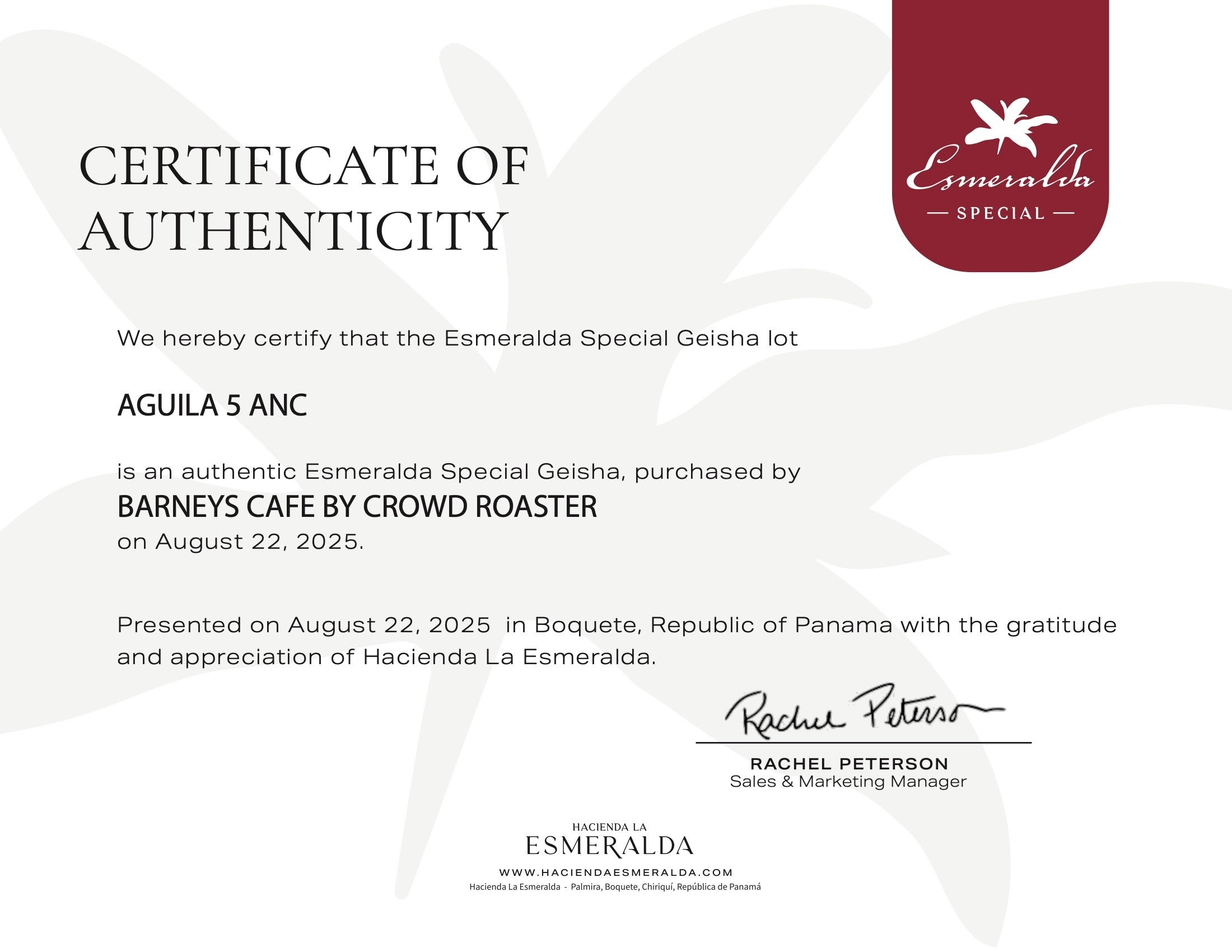 「ハシエンダ・ラ・エスメラルダを代表して、東京・銀座における貴店の開店を心よりお祝い申し上げます。この記念すべき機会のために、Aguila 5 ANCロットを特別にご用意できましたことを、大変光栄に存じます。革新的な低温嫌気性発酵プロセスによって丁寧に仕上げられたこの特別なゲイシャコーヒーは、私たちの農園が追求する卓越性の頂点を体現するものです。
