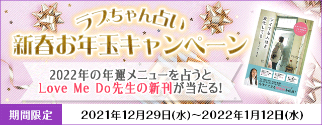 有名芸能人の結婚やスキャンダルから自然災害、政治・経済まで様々なニュースを的中させる『予言的中の占い師』Love Me Do。現在、月額公式サイト『ラブちゃん占い』にて「ラブちゃん占い 新春お年玉キャンペーン」を開催中です。期間中、2022年の運勢占いをご購入いただいた方の中から抽選で3名様に、新刊の『ツイてる人ほど変化してる 幸せを呼び込む小さな魔法のルーティン(ヨシモトブックス)』をプレゼントいたします。ぜひこの機会にご利用ください。