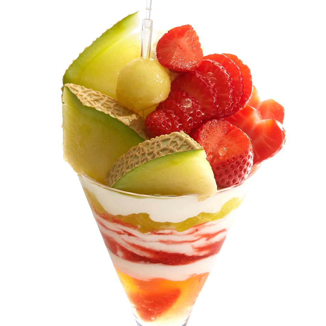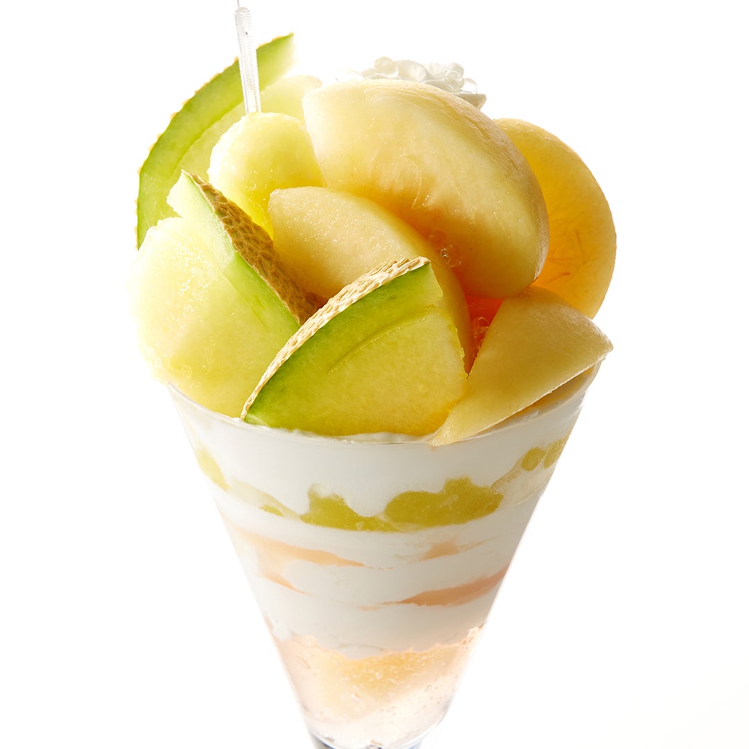 芳醇できめ細かな果肉のマスクメロンと、さわやかな甘みと酸味のある国産苺を組み合わせたパフェです。苺ジャムを絡めたソフトクリームに、香り豊かなメロングラニテを重ね、トップには苺シャーベットとバニラアイスをトッピングしています。
