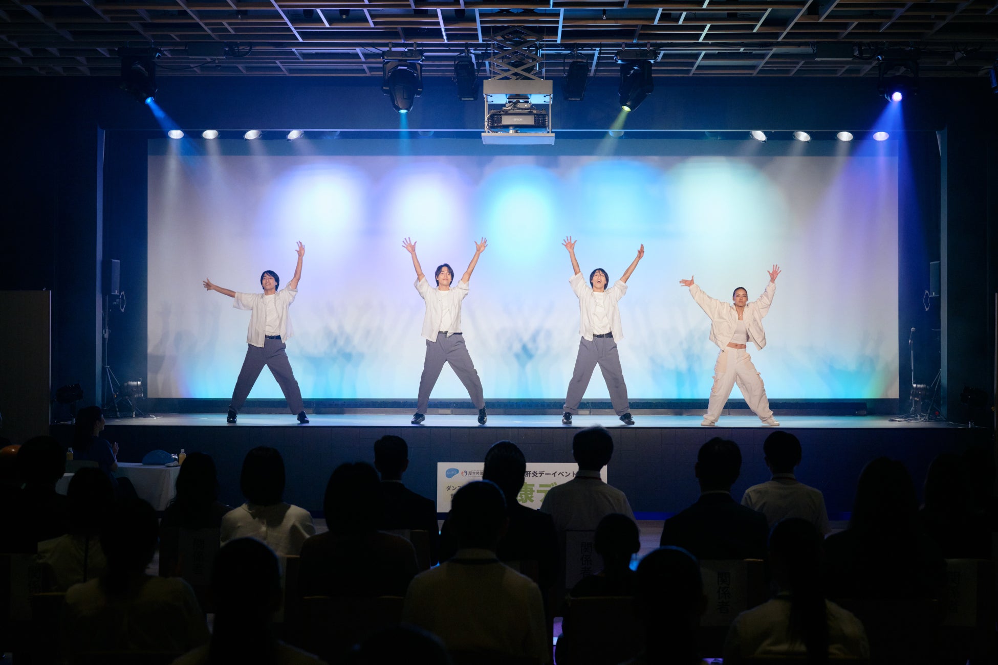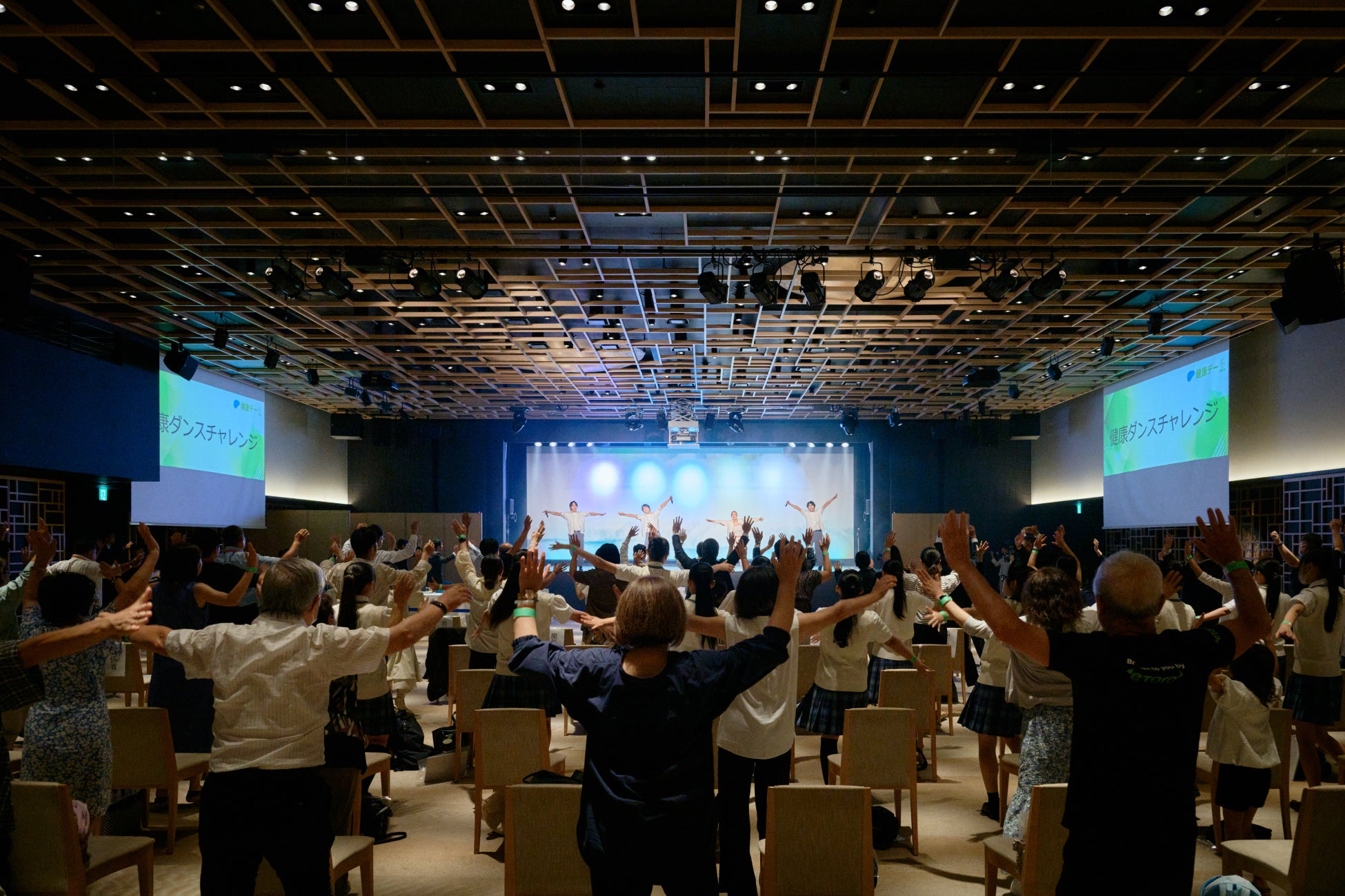 イベントの終盤では、「健康一番プロジェクト」のサポーターを務めるMaasa氏と、久留米大学医学部 内科学講座消化器内科部門 主任教授の川口 巧先生らを中心に制作した「健康ダンス」を初披露しました。国民の健康増進を目的とし、ひとつひとつの動きに意味や効果が込められた、幅広い層へ向けたプログラムになっています。そして初披露した「健康ダンス」を、Maasa氏と佐藤三兄弟がステージに立ち、会場に集まった約100人の観客にダンスレクチャーを行いました。Maasa氏は「ダンスを通して健康になりましょう!」と呼びかけながら、身体を動かすことの楽しさを伝えました。ダンスレクチャーの後、音に合わせて全員で踊ったダンスチャレンジでは、皆が笑顔になり、会場に一体感が生まれていました。
