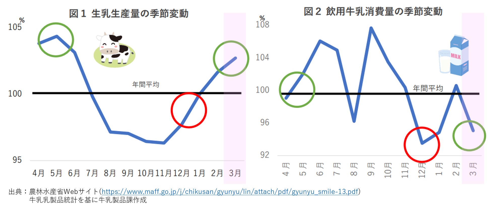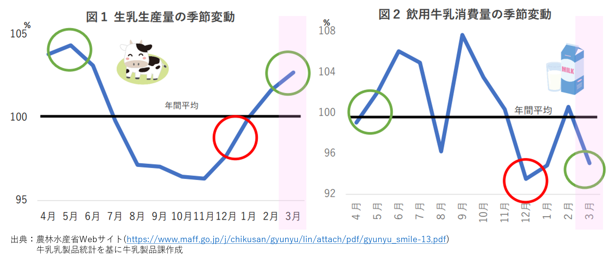 乳牛から絞られる牛乳は1年を通して生産されています。とくに春先は牛にとって快適な気温であり、生乳の生産が好調になるタイミング。(※図1)しかしながら春先はまだ気温が低く、牛乳や乳飲料、アイスクリームなどの消費量は1年の中でも少なくなります。さらに、3月~4月は春休み期間であり、全国的に学校給食が休止してしまうことから、結果的に需要は例年低調となっています。(※図2)