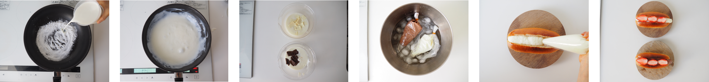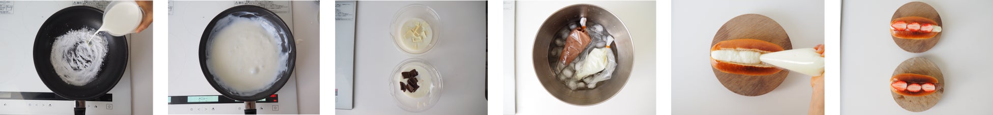 コッペパンは酪農家さんへのリスペクトを込めた逸品。酪農家さんから教わった牛乳のおやつであるミルク餅。ここにハチミツ、チョコレートを加えてとろける食感のクリームをオリジナルで開発しました。素朴さのあるコッペパンに絞り出して、大山バター、いちごと一緒に食べるスイーツを考えてみました。