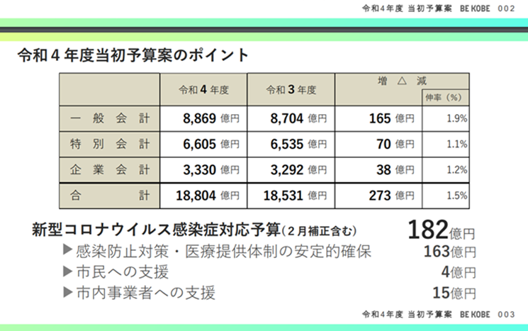 神戸市は、令和4年度(2022年度)当初予算案を発表しました。この中から、次年度の、神戸市の大きな動き、トピックをお伝えいたします。ぜひ企画の一助としていただければ幸甚です。