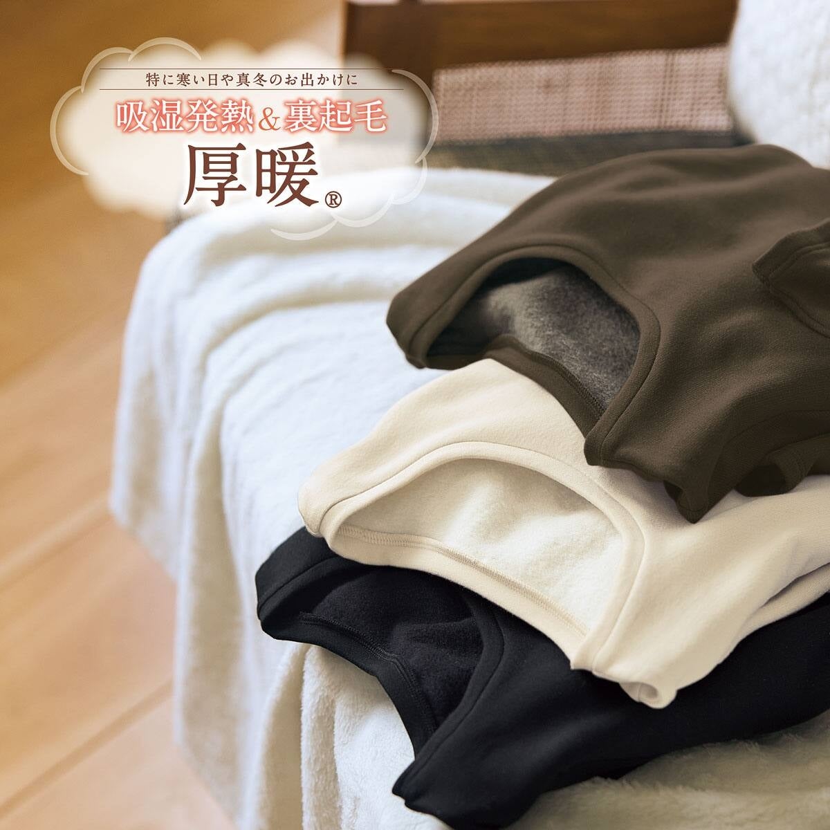 厚地で暖かな「厚暖®」インナーが新登場!表はつるんと滑らかでアウターのすべりがよく、きれいな表面感。肌側は柔らかさが特徴の甘撚り綿を使用し、しっかり起毛をかけてこだわりの肌ざわりに仕上げました。体から発散される水分を吸着して発熱する吸湿発熱機能があり、裏起毛が空気の層を作って暖かさをキープしてくれるから、寒さを忘れてしまうかのような暖かさ。伸縮性もあるから、厚めの素材でも動きやすく、快適に着用していただけます。