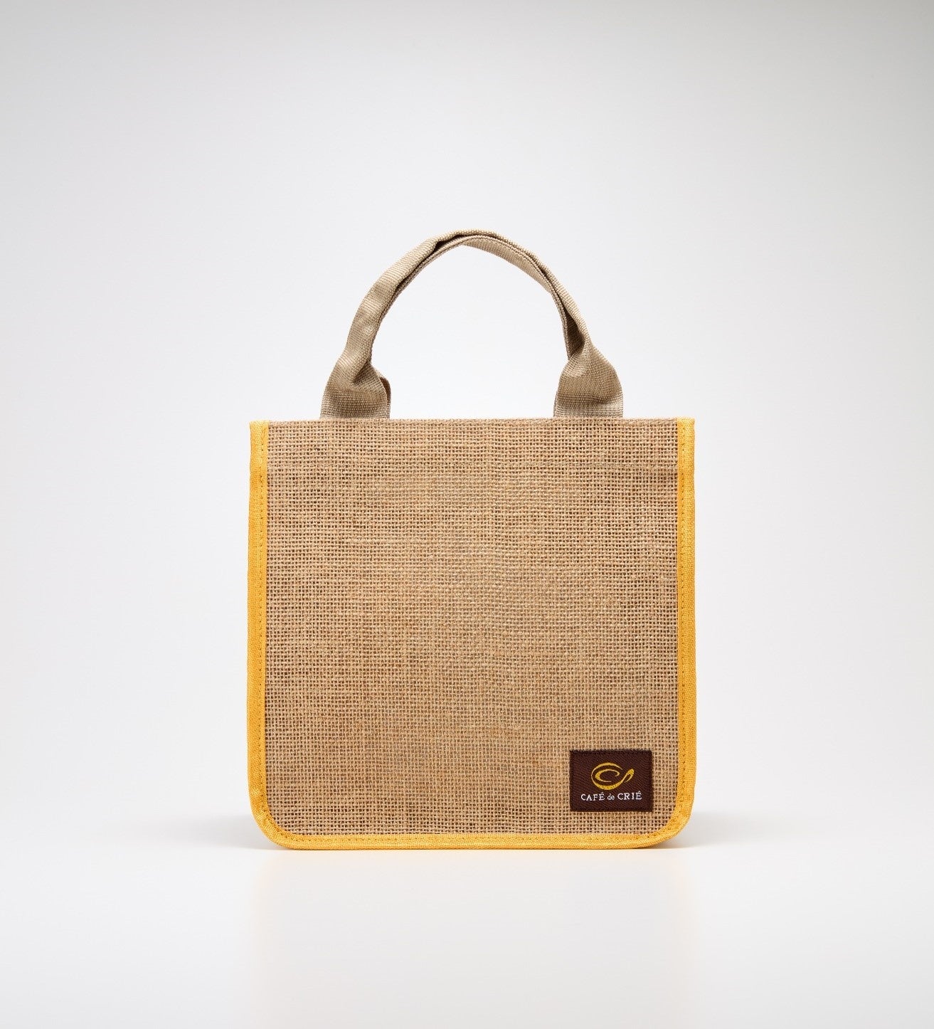 オリジナルバッグは、耐久性・通気性に優れており、夏場に最適なジュート素材を使用。バッグのふちには、ブランドカラーであるクリエイエローのアクセントカラーを、バッグの下部には『カフェ・ド・クリエ』のロゴを入れることで、シンプルながらも個性的で、普段使いしやすいデザインに仕上げました。