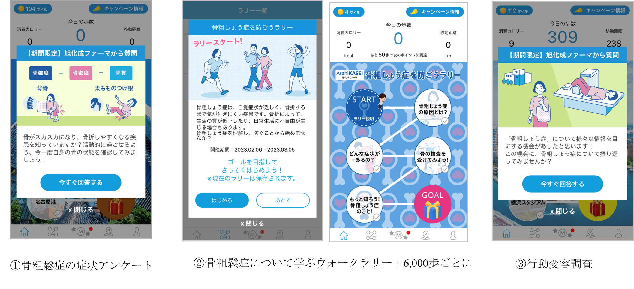 次に6,000歩毎に骨粗鬆症についての原因・症状・検査方法を学ぶウォークラリーを実施、416,101人がラリーに参加し、ゴールしたユーザーは338,487人でした。骨粗鬆症の潜在患者とそのご家族だけでなく、多くのスギサポwalkユーザーに対して疾患啓発を行うことができました。