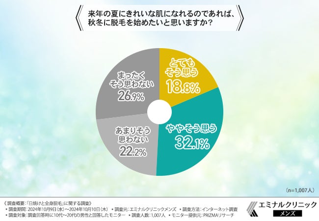 「来年の夏にきれいな肌になれるのであれば、秋冬に脱毛を始めたいと思いますか?」と質問したところ、『とてもそう思う(18.8%)』『ややそう思う(32.1%)』『あまりそう思わない(22.2%)』『まったくそう思わない(26.9%)』という回答結果になりました。