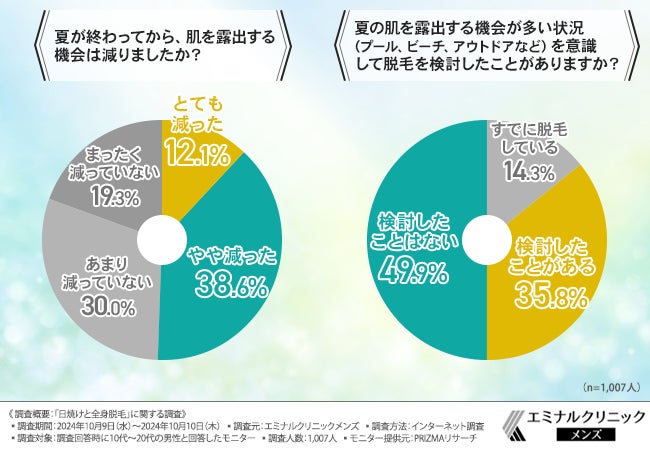 しかし、約半数の方が来年の夏に向けて秋冬から脱毛を始めたいと回答し、来年の夏に肌を露出する機会に向けて脱毛をしたいと考える男性が多いことが示されました。