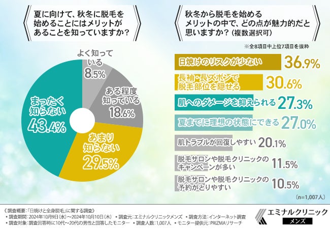 さらに「日焼けのリスクが少ない」「長袖・長ズボンで脱毛部位を隠せる」といった秋冬に脱毛を始めるメリットに関する認知度も同様に低いことが明らかとなりました。