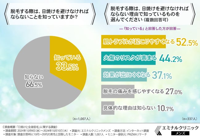 「脱毛する際は、日焼けを避けなければならないことを知っていますか?」と質問したところ、『知っている(33.5%)』『知らない(66.5%)』という回答結果になりました。