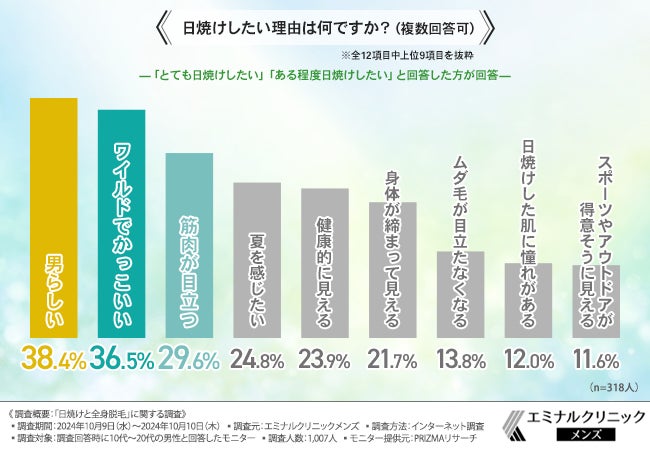 「とても日焼けしたい」「ある程度日焼けしたい」と回答した方に「日焼けしたい理由は何ですか?(複数回答可)」と質問したところ、『男らしい(38.4%)』と回答した方が最も多く、次いで『ワイルドでかっこいい(36.5%)』『筋肉が目立つ(29.6%)』と続きました。