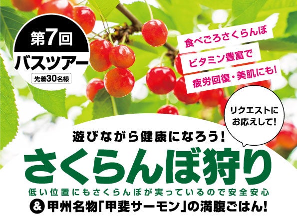 6月のバスツアーは予てよりお客様からリクエストをいただいておりました「さくらんぼ狩り体験&甲州名物甲斐サーモンの満腹ごはんツアー」となります。低い位置にさくらんぼが実っているため、安全安心にご参加いただけます。さくらんぼはビタミンが豊富で疲労回復や美肌にも効果があると言われておりますので、さくらんぼ狩りを楽しみながら健康を促進していけるツアーとなっております。