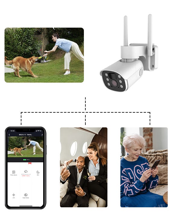 専用アプリでカメラの録画を共有し、家族や友人とリアルタイムで映像を見たり、操作したりすることができます。