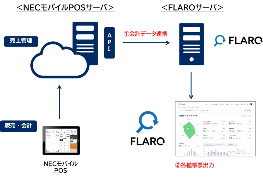 今回の連携により、NECモバイルPOSクラウドサーバからFLAROサーバへ自動で売上データが取りこむことができるようになりました。