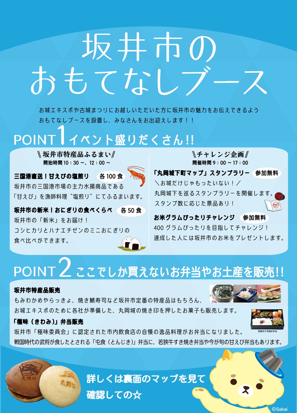 10月12日、13日開催の【出張!お城EXPO in 坂井・丸岡城2024】に参加予定の方は、忘れず会場周辺にある「坂井市おもてなしブース」へお立ち寄りください!そして、同時開催の古城まつりもぜひご参加ください。
