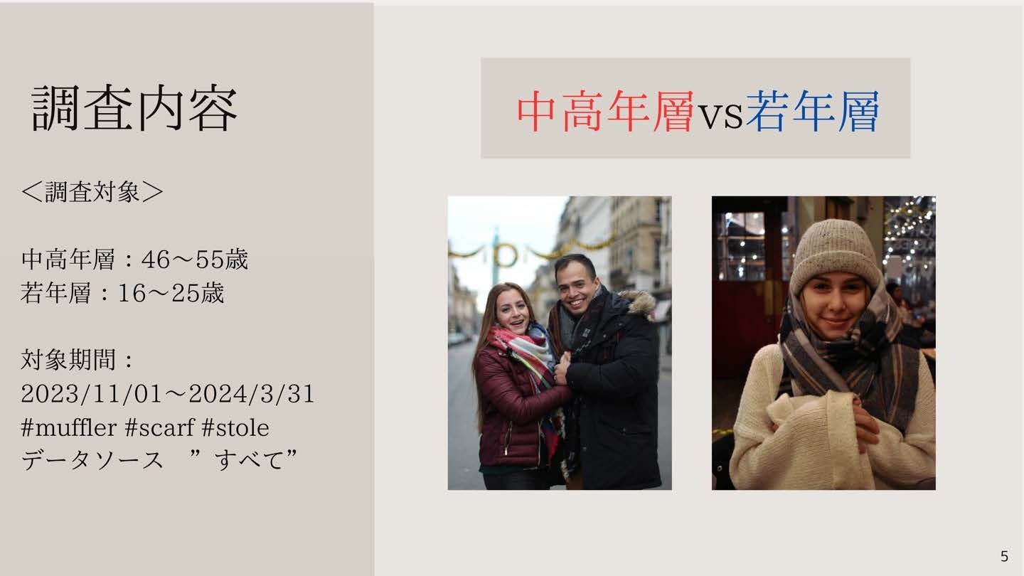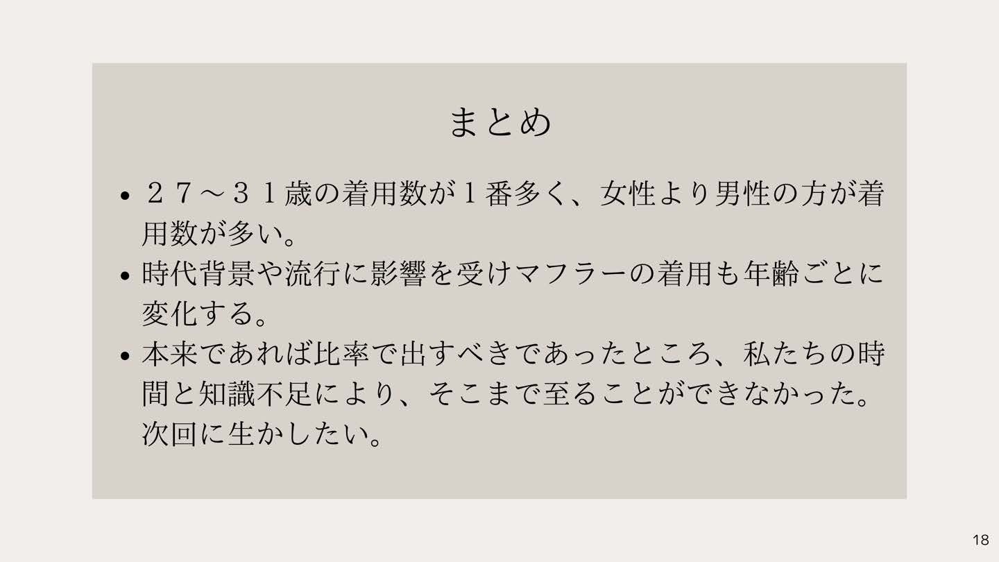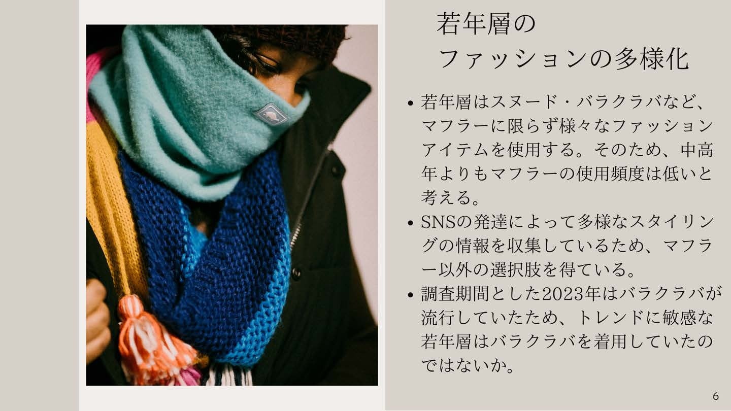 この授業内で、学生が実際に企画・データ分析した成果から、特に優秀と評価したレポートをシリーズで公開します。2025年第3弾のテーマは「マフラーの着用率はどの年代が一番多いのか?」。