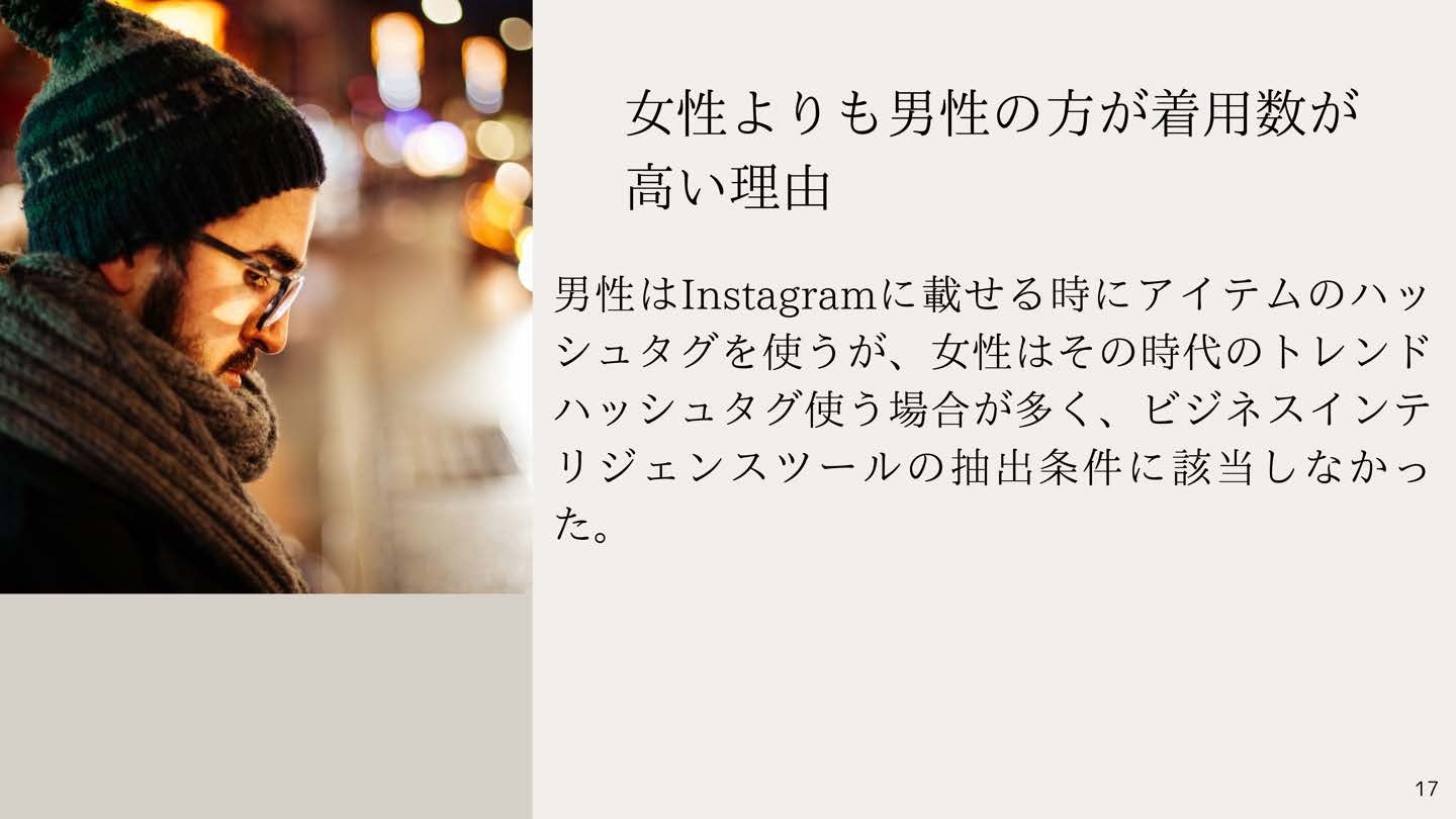 Instagramから収集した情報ソースを引き合いに、データに基づいて様々な観点から分析されています。