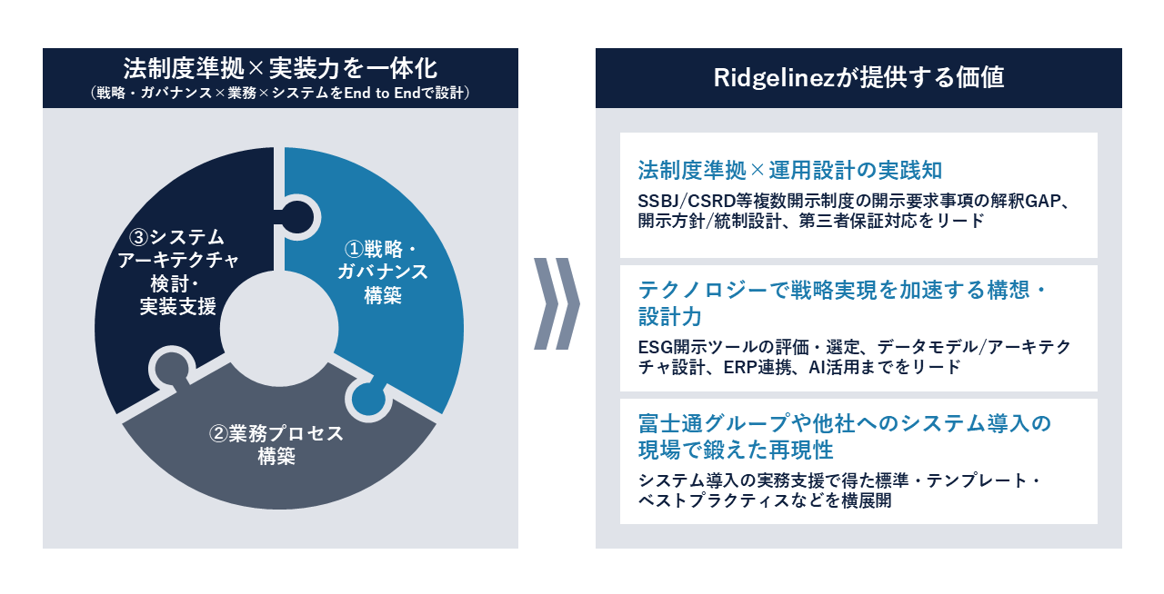 Ridgelinez株式会社(本社:東京都千代田区、代表取締役社長CEO:森光 威文、以下Ridgelinez)は、SSBJ基準/CSRD等に準拠したサステナビリティ情報開示の「戦略・ガバナンス×業務プロセス×システム」をEnd to Endで支援するサービスを提供開始します。