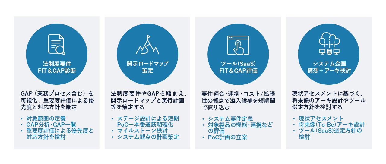 これらの開示体制を構築するためには、グループ全社を巻き込んだ組織横断のプロジェクト体制を構築し、いかに効率的・効果的に、開示戦略に基づいたガバナンス態勢や業務プロセスを構築し、既存システムの活用も考慮しシステム導入を推進できるかが成功のポイントとなります。