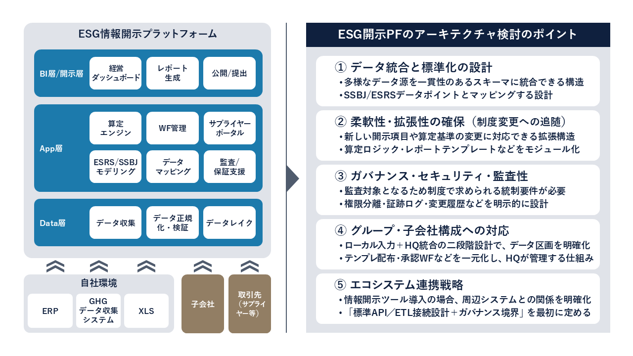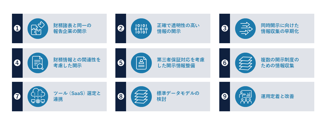 企業は最新制度動向を捉えて各国情報開示基準に準拠し、外部監査人等の第三者保証を得た正確かつ透明性の高い情報を財務諸表と同時に開示する体制や、実務で機能する開示運用とデータ基盤を整備する必要があります。