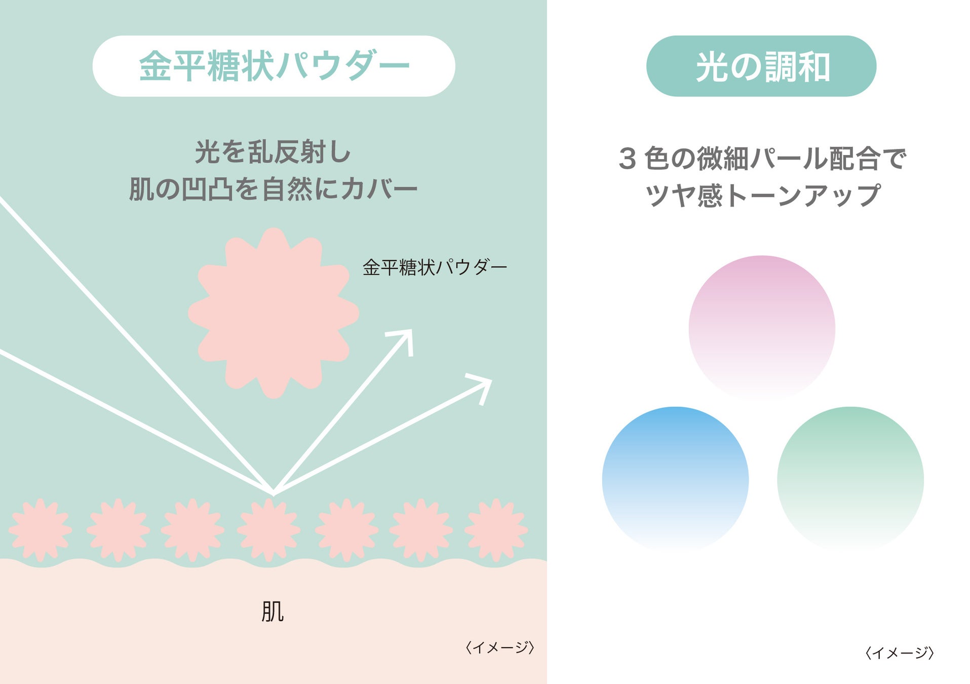 赤みだけでなく毛穴や凹凸もカバーします。金平糖のような小さな粒子が光を四方に散らし、毛穴や凹凸をふんわりぼかしながら、3色の繊細パールが肌の上で自然に混ざり合い、内側からにじむようなツヤ感と明るさをプラスします。