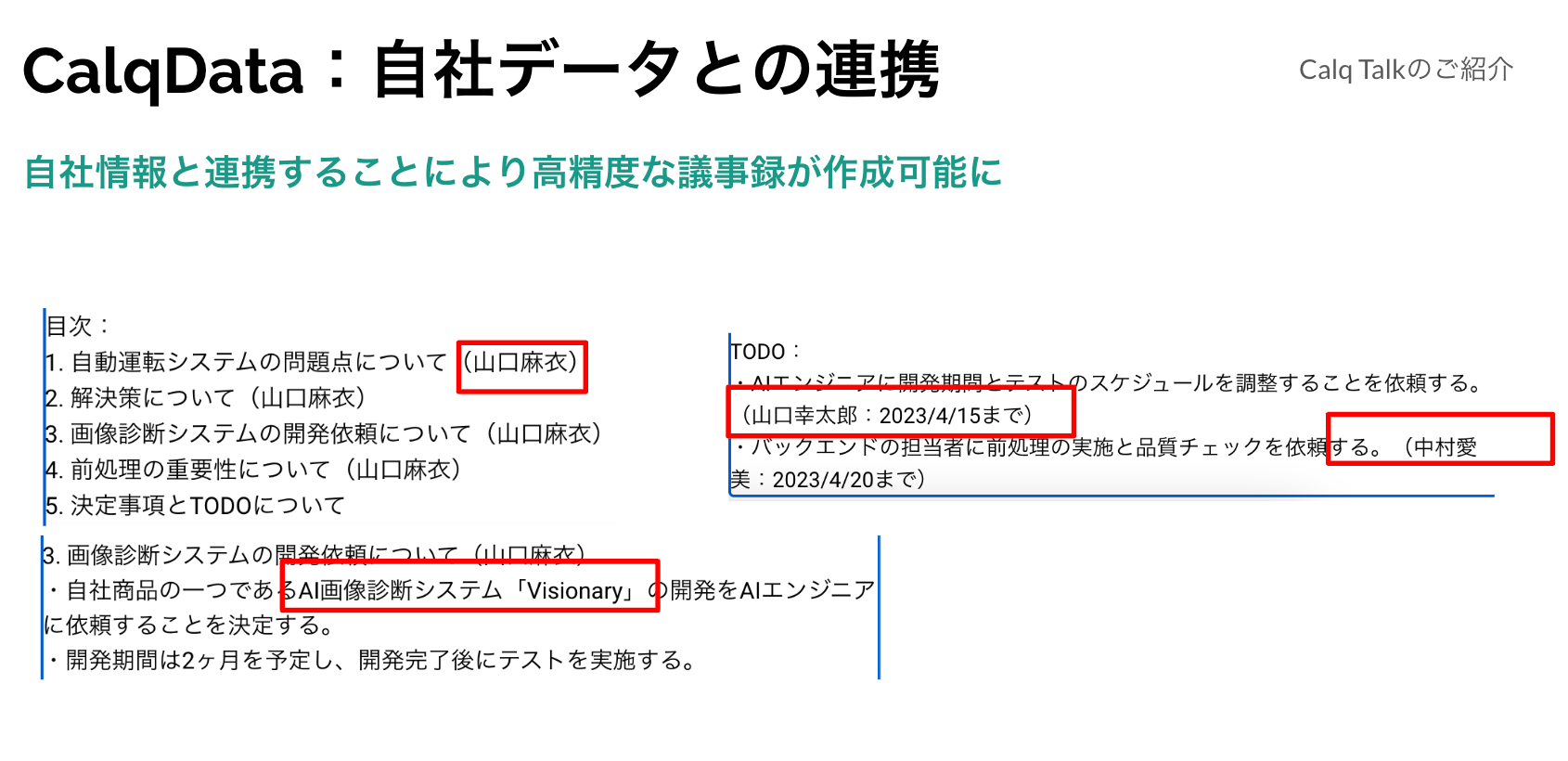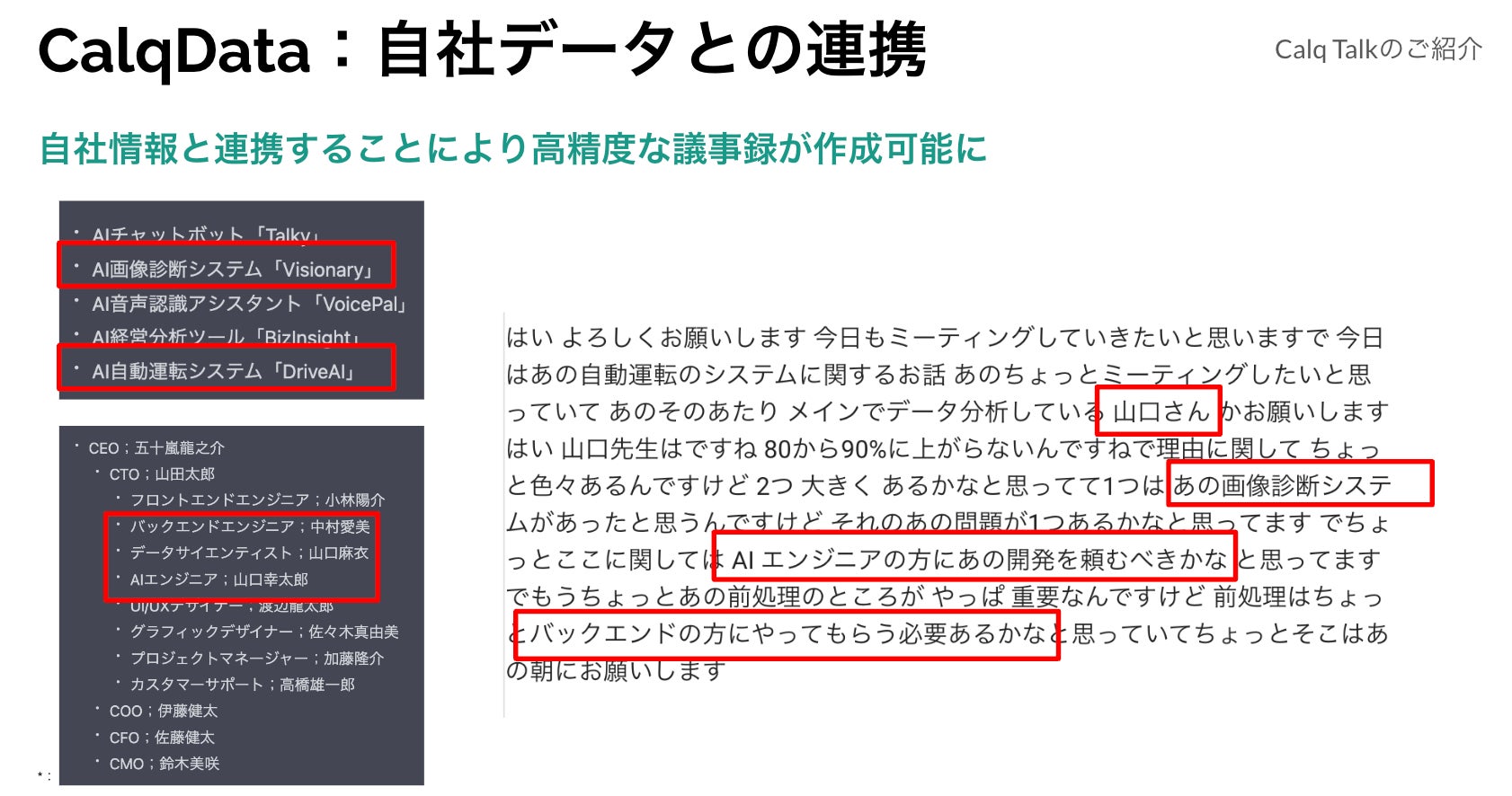 以下は自社データ連携の様子。自社プロダクトと自社社員の情報から高度な議事録作成が可能となる。