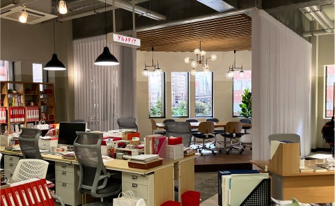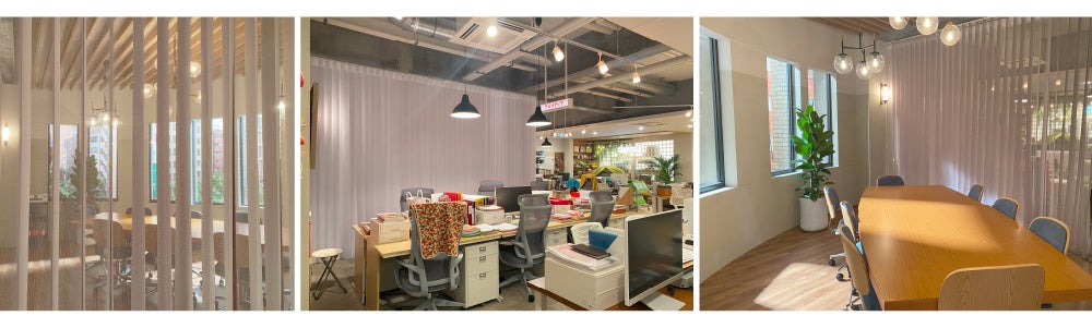 主人公が勤めている雑誌編集部のオフィスに、調光タテ型ブラインド「エアレ」が使われています。バーチカルブラインドの調光機能と、カーテンのようなふんわりと優しい雰囲気をあわせもつ「エアレ」。バトンをまわすだけでお部屋に取り入れる光を自由にコントロールできるのが魅力です。ドラマでは、奥のミーティングスペースを囲むように取り付けることで、空間の仕切りとして使用されています。柔らかい生地感や淡いグレージュのカラーが、上品ながらも優しく温かみのある雰囲気に仕上げています。