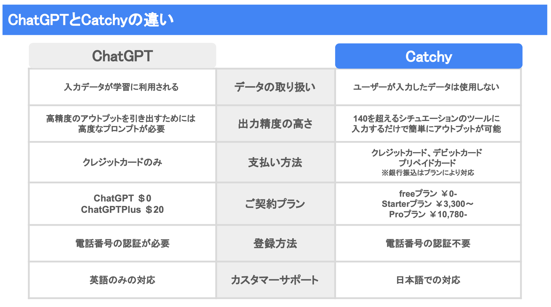 Catchyは、文章作成業務を効率的にサポートするAIライティングアシスタントツールです。キャッチコピーや記事の生成、要約、リライト、動画や新規ビジネスの企画提案まで、140を超える様々なシチュエーションでご活用いただけます。