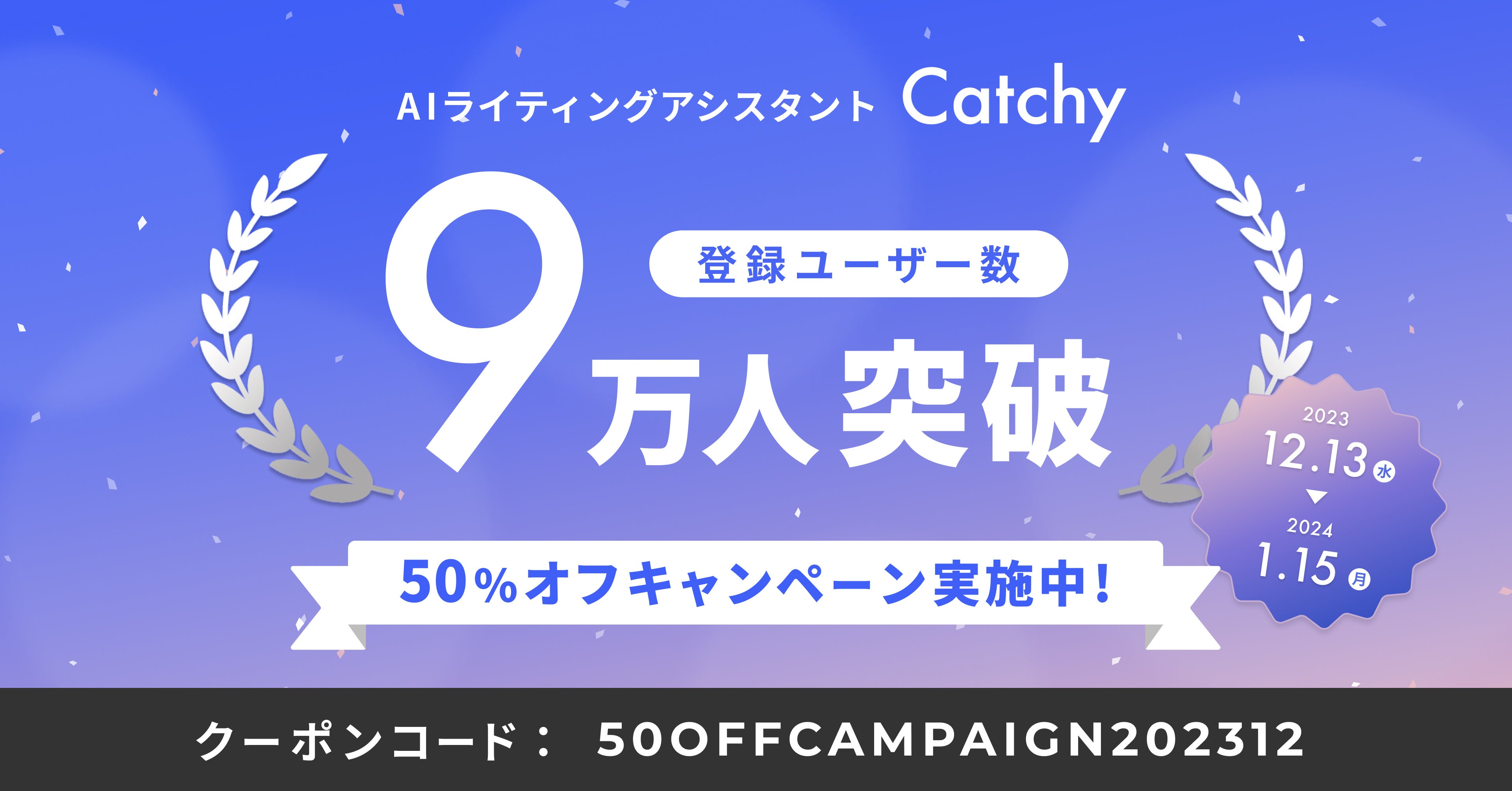 2022年7月のリリースからわずか1年4ヶ月、AIライティングアシスタントツール「Catchy (キャッチー)」の会員数が9万人を突破しました!感謝を込めて50% OFFキャンペーンを開催します!