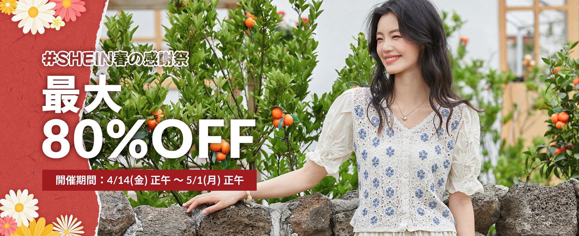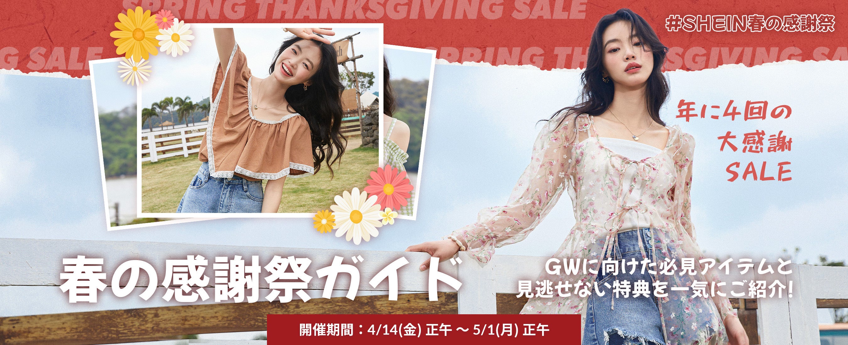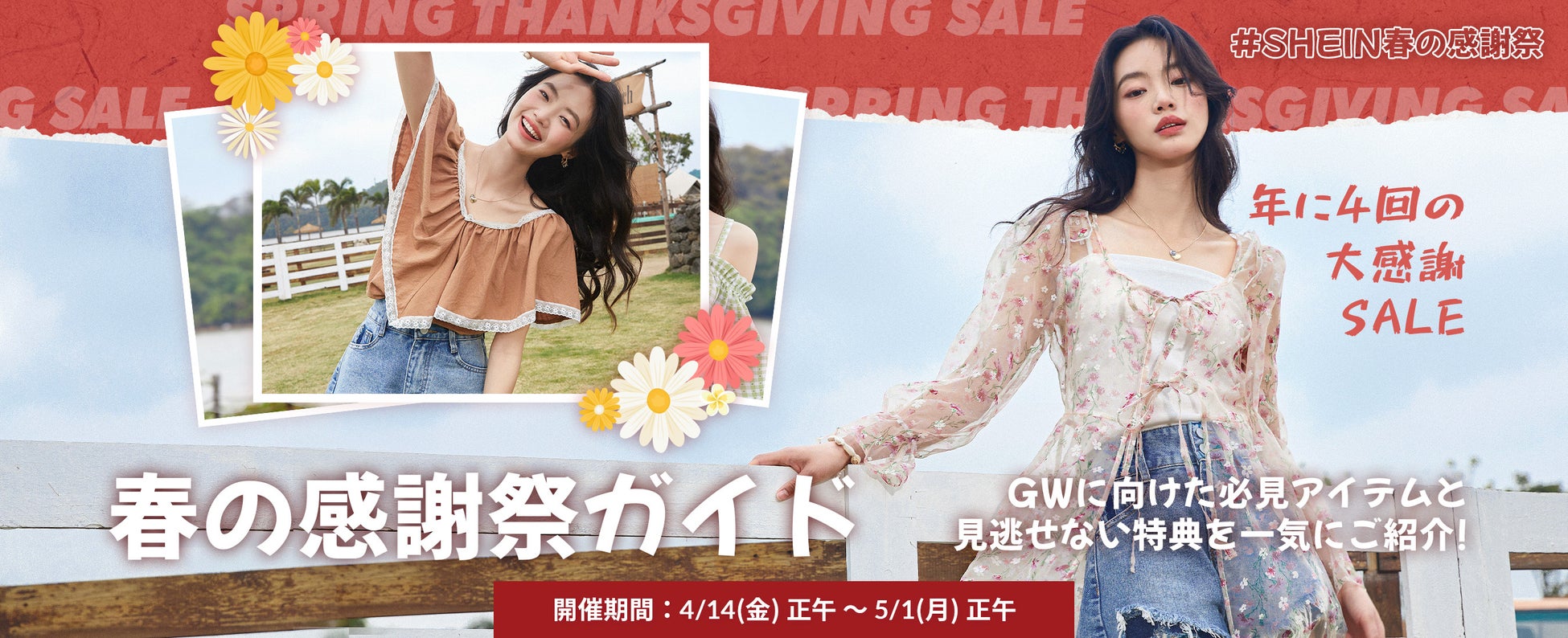SHEIN Group(https://www.sheingroup.com/)が展開するグローバルファッションブランド「SHEIN(シーイン)」は、2023年4月14日(金)12:00~2023年5月1日(月)12:00の期間限定で、GWのおでかけイベントに向けて、SHEIN必見アイテムをお得にお買いお求めいただける『#SHEIN春の感謝祭』を開催いたします。 期間中は、主要商品カテゴリを最大80%オフでご購入いただけることに加え、メガタイムセール期間中は、全品1,000円以下でご購入いただけます。その他、最大25%オフとなる特大クーポン配布、週末限定で送料無料など、「SHEIN」の商品をお得にお買い求めいただける様々なキャンペーンをご用意しております。