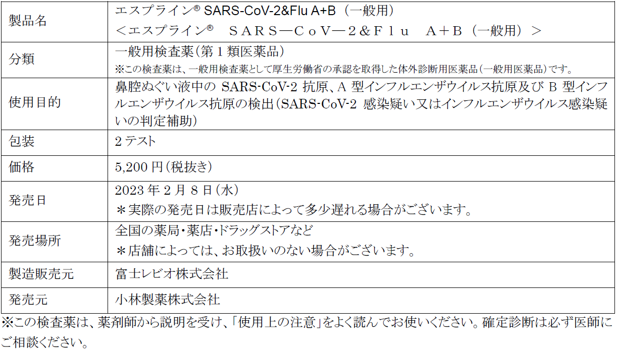 小林製薬株式会社(本社:大阪市、社長:小林章浩、以下「当社」)は、新型コロナウイルス(SARS-CoV-2)抗原とインフルエンザウイルス抗原を同時に検査できる一般用抗原定性同時検査キット「エスプライン® SARS-CoV-2&Flu A+B(一般用)」(以下、当キット)を2月8日に発売いたします。