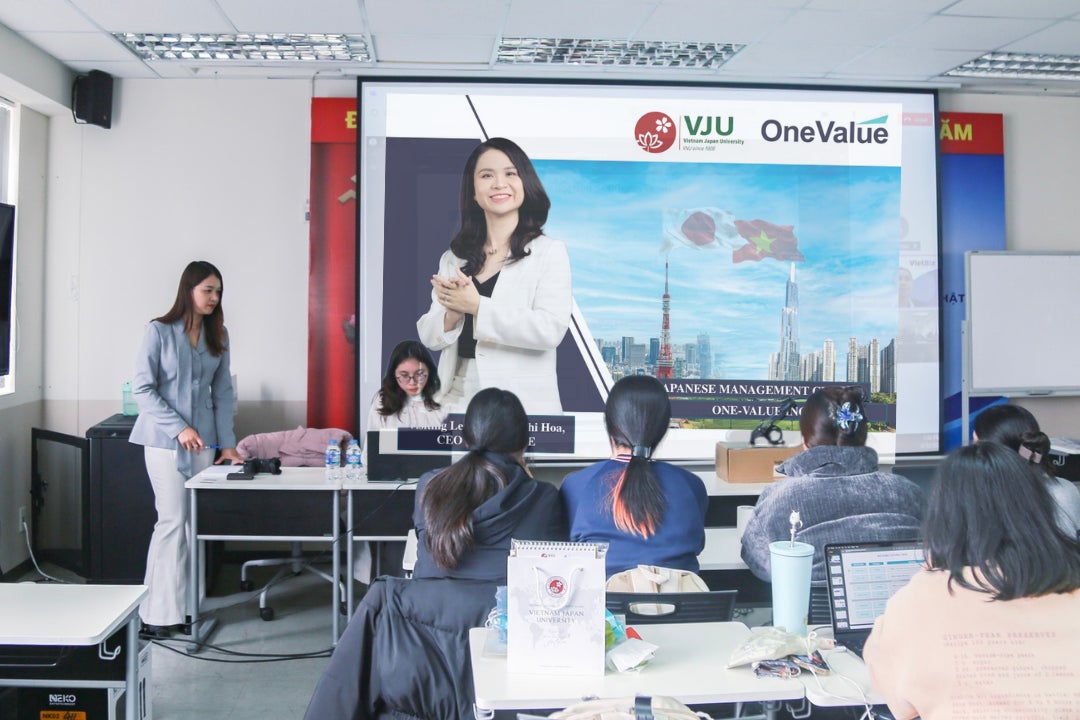 今回の覚書の締結に先立ち、2025年2月、ONE-VALUEの代表取締役社長フィ ホアは、ベトナム日越大学で「ジャパニーズ・マネジメント」の授業を担当し、学生および教職員から非常に高い関心を集めました。授業では、M&A分野における戦略的アプローチやコンサルティングスキル、また日本企業で求められる働き方について深く掘り下げて解説しました。さらに、日越大学の卒業生であり、現在ONE-VALUEでM&Aコンサルタントとして活躍しているディエウ・リンも、自身のキャリアパスを紹介し、学生たちに将来のキャリア開発を検討するためのインスピレーションを与えました。