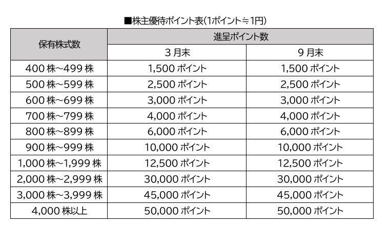 2025年9月末日時点の当社株主名簿に記載又は記録された400株以上保有の株主様を対象に開始いたします。以降は、毎年3月末日、9月末日時点の当社株主名簿に記載又は記録された400株以上保有の株主様を対象といたします。