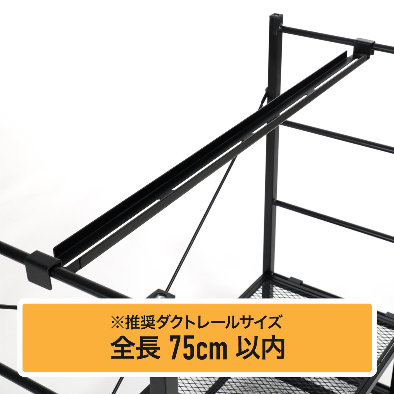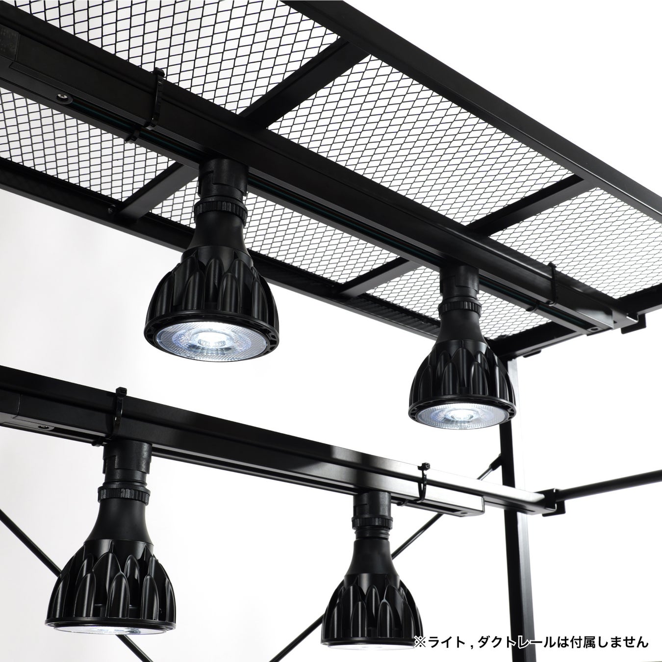 市販のダクトレールを結束バンドなどで固定できる専用バーが付属。育成ライトやサーキュレーターを、任意の高さへ簡単に取り付け可能です。また、棚板には通気性に優れるメッシュスチールを採用。植物をたくさん並べても空気の循環がしやすいよう配慮しました。ビザールプランツの成長に最適な環境を整備しやすい仕様です。