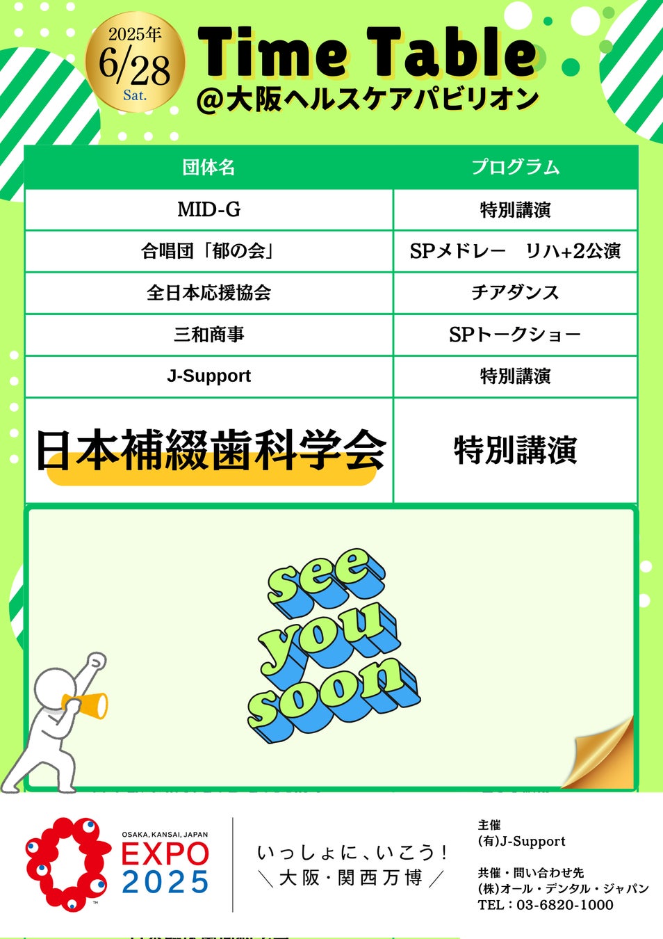 【東ゲート入ってすぐ右手側】大阪ヘルスケアパビリオンにて、有限会社J-Supportと株式会社オール・デンタル・ジャパン(ADJ)がタッグを組み、1日限定の特別イベントをプロデュース!