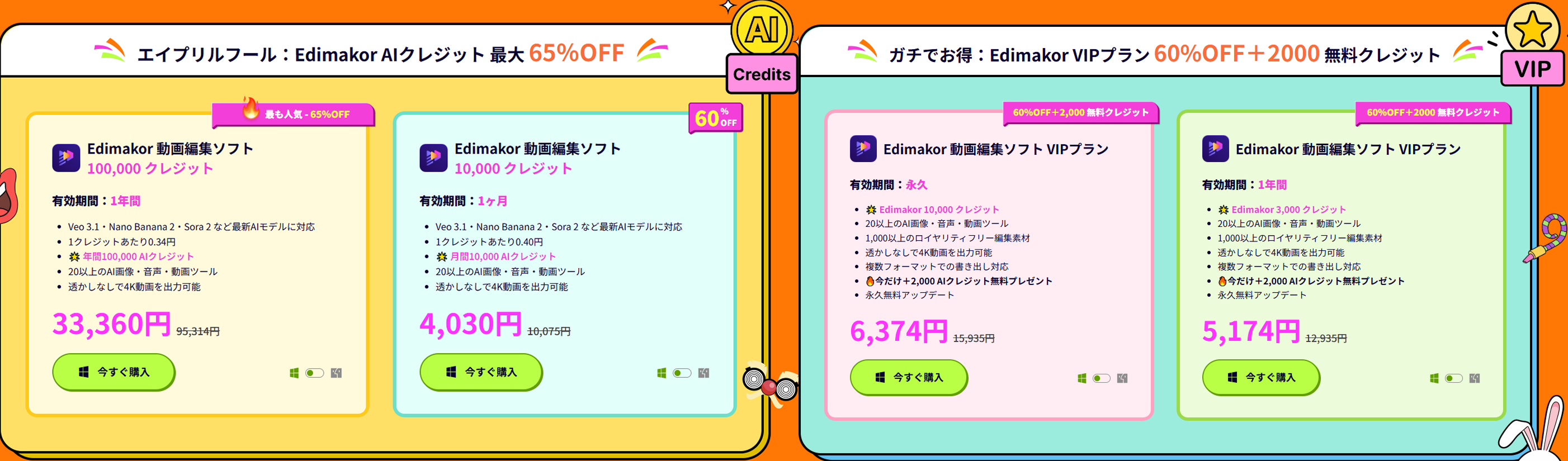 VIP年間プラン:60%OFF+2,000AIクレジット付与 (👍初めての方におすすめ)