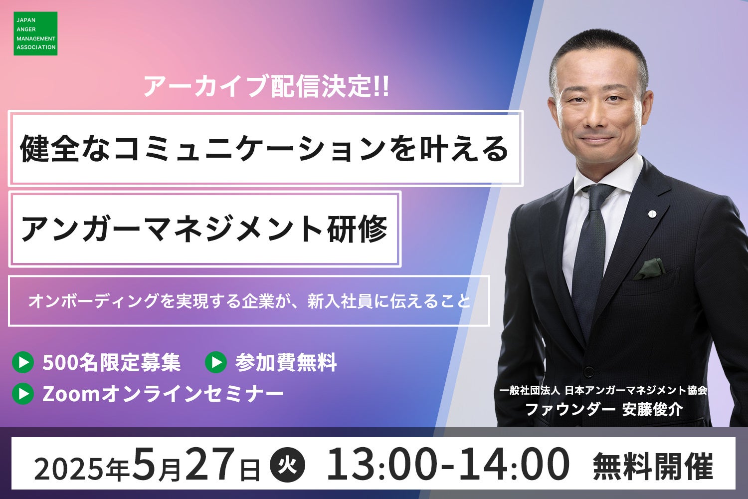 【5月27日(火)13時開催】アンガーマネジメントの第一人者、安藤俊介による人事研修担当者向けオンラインセミナー「健全なコミュニケーションを叶えるアンガーマネジメント研修」好評につきアーカイブ配信決定