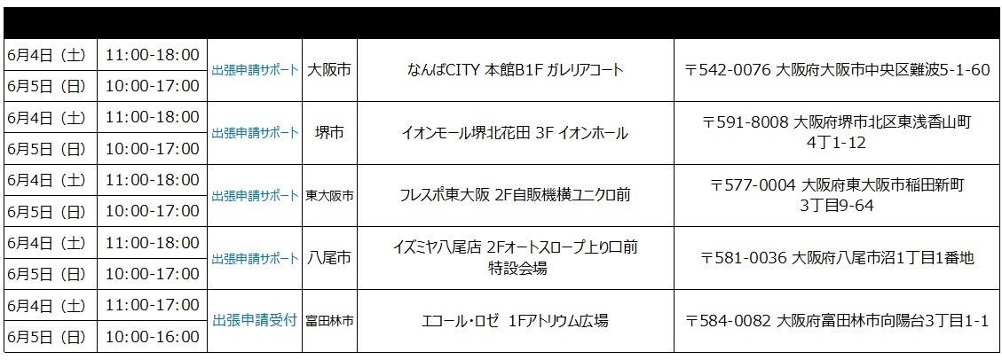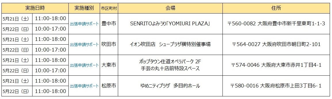 ※開催場所の調整状況や新型コロナウィルスの感染状況等により、「出張申請受付」及び「出張申請サポート」の開催を中止・延期、または実施内容が変更となる可能性がございます。