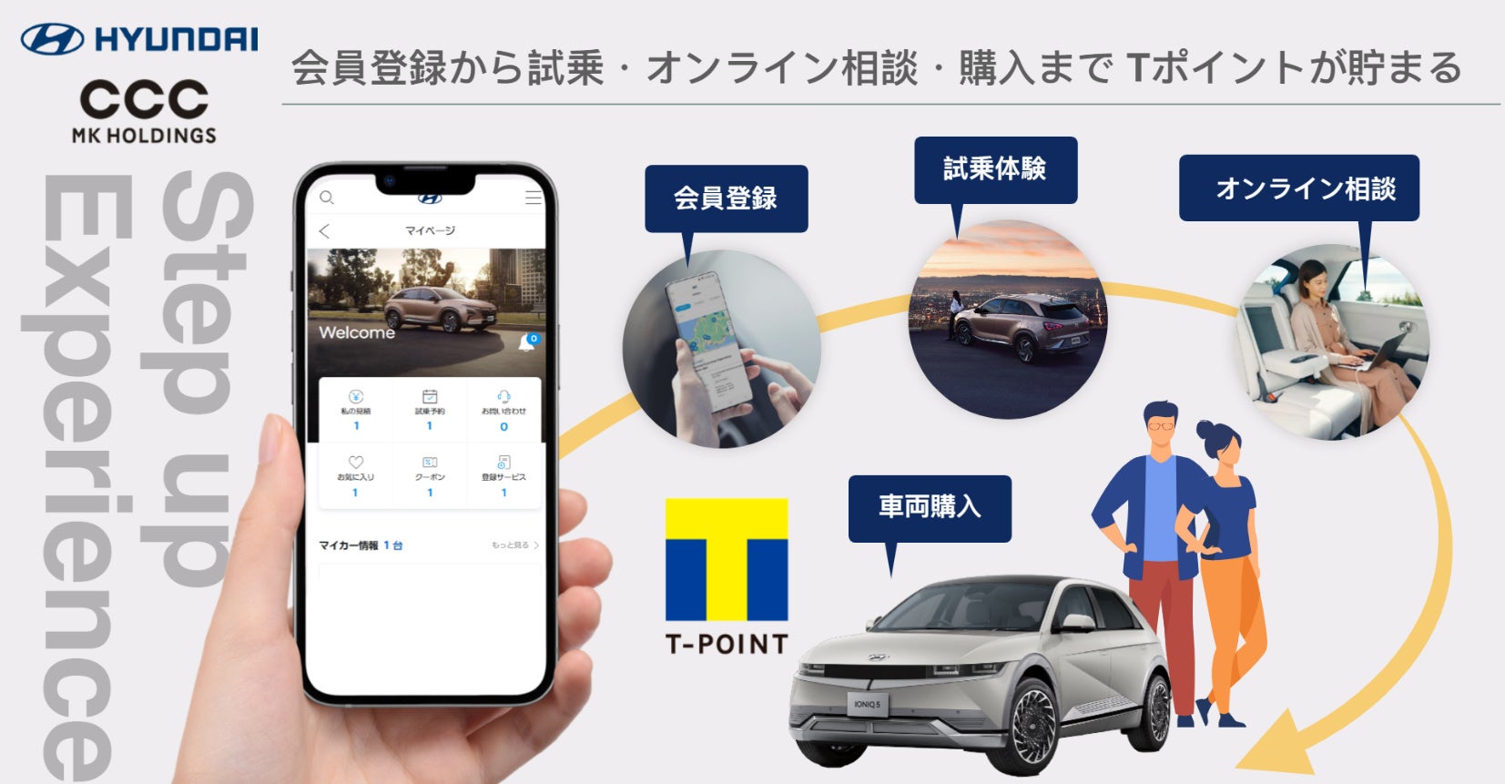 Hyundai Motor Company、Hyundai Mobility Japan株式会社およびCCCMKHDの親会社であるカルチュア・コンビニエンス・クラブ株式会社は、2023年6月にZEV※2(Zero Emission Vehicle:ゼロエミッション・ビークル)時代の共創パートナーとして協業していくことに基本合意いたしました。持続可能な社会の実現に向け、「ZEVを通じた新しいライフスタイル」を日本国内に浸透させる取り組みを進めており、このたびのTポイントサービス開始もその一環となります。