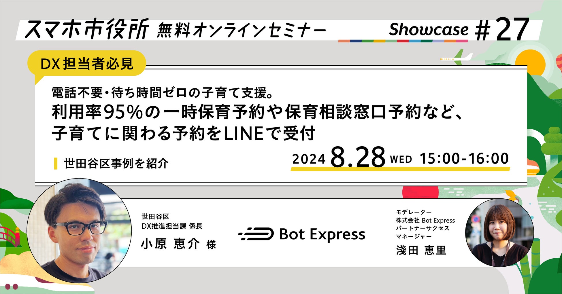 株式会社Bot Express(本社:東京都港区、代表取締役:中嶋 一樹、以下 Bot Express)は、スマホ市役所を実現している官公庁・地方自治体の事例を共有する無料オンラインセミナー「Bot Express Showcase」を毎月開催しています。8月28日の開催が決定しましたのでお知らせいたします。