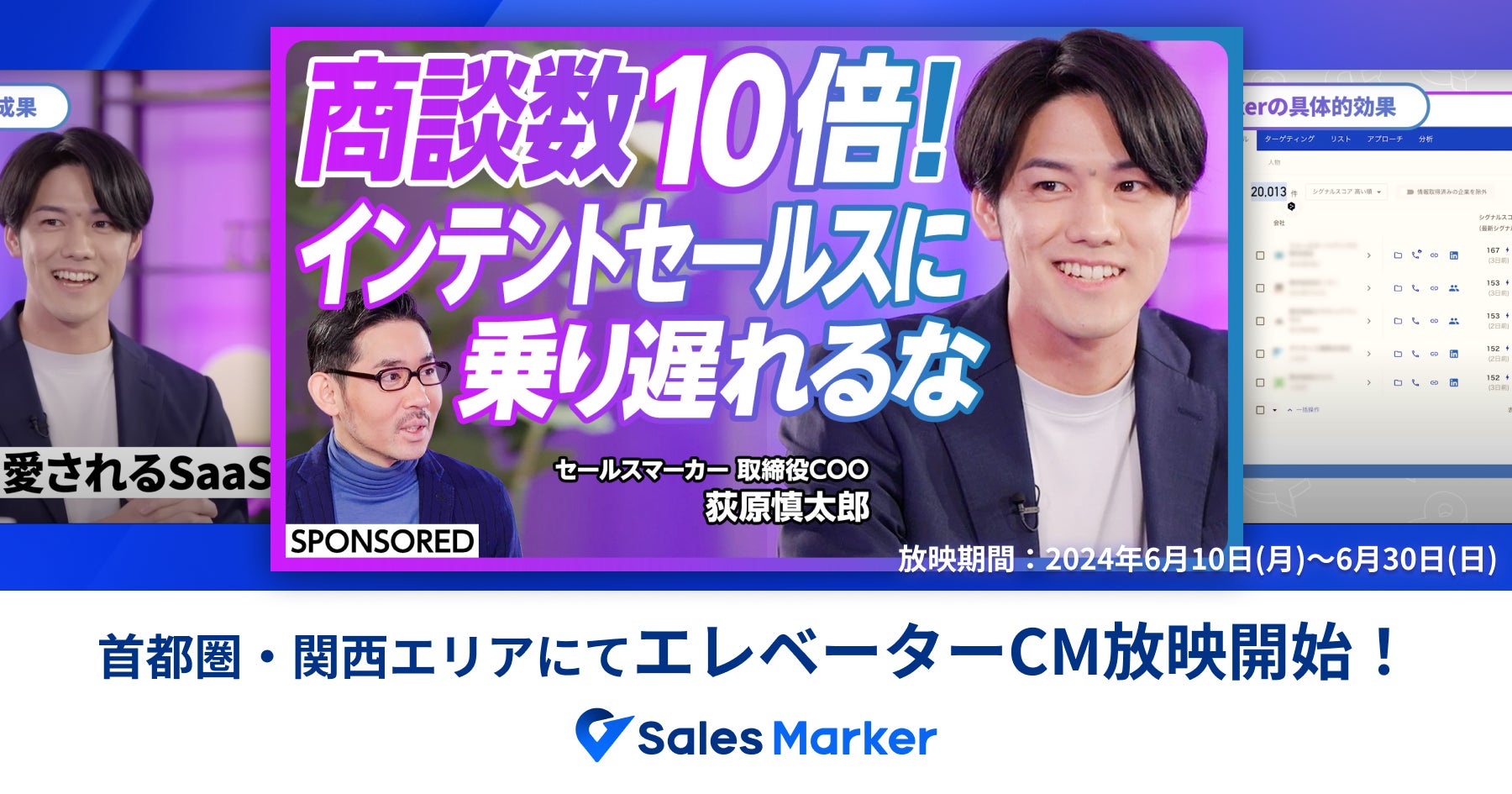 国内初※1「顧客起点」でおこなう新時代の営業手法「インテントセールス」を実現する『Sales Marker(セールスマーカー)』を開発・提供する株式会社Sales Marker(本社:東京都港区、代表取締役 CEO:小笠原 羽恭)は、Sales Marker導入企業をゲストにお迎えし、インテントセールスを題材に実際の成果についてお話しいただいた映像コンテンツを、6月10日よりエレベーターCMとして放映開始したことをお知らせします。本CMで放映される映像は、映像メディア「PIVOT」にて公開されている動画を編集したものです。