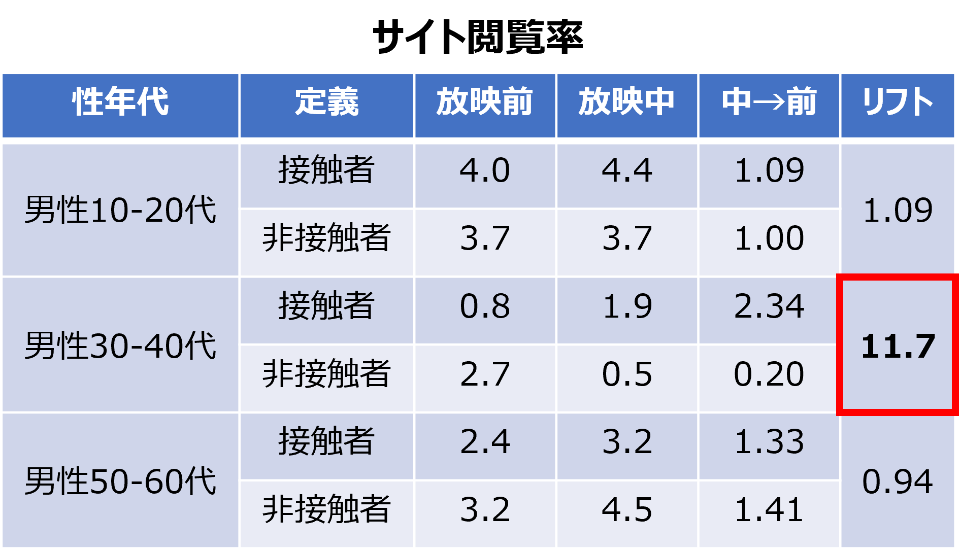 上記の分析を性別で分けると男性の検索行動が高く、特にワード検索率の年代別では、男性30-40代で5.50倍のリフト値、男性50-60代で3.77倍、男性10-20代で1.49倍と、全ての年代で顕著に効果が見られました。サイト閲覧率も同様に、男性30-40代で大幅なリフト値となり、検索行動の効果となりました。